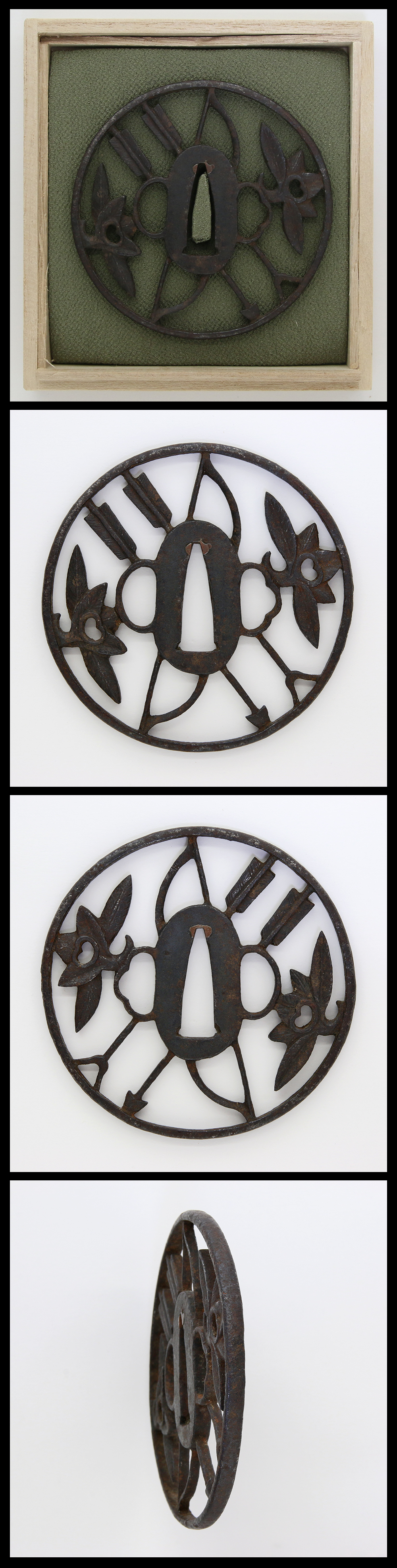 Special feature: Round shaped iron Tsuba. A bow, arrows and maple leaves are engraved with openwork.