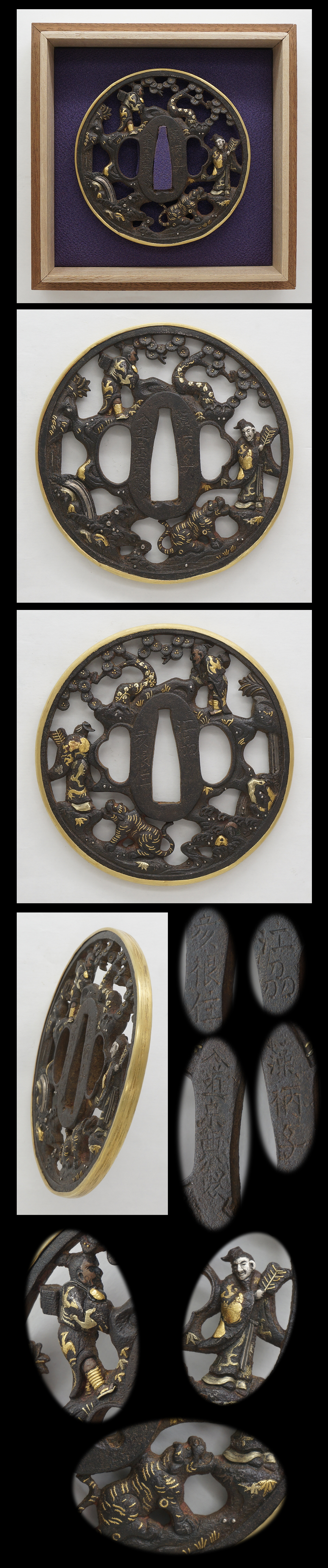 Special feature: Round shape iron tsuba with tiger and human design engraved and inlayed with gold.