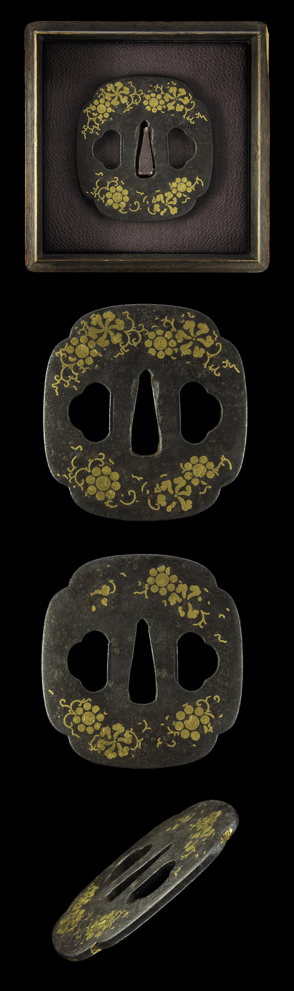 Special feature: On mokko shape tsuba, there is a flower shape in gold inlay. It is Higo style tsuba.