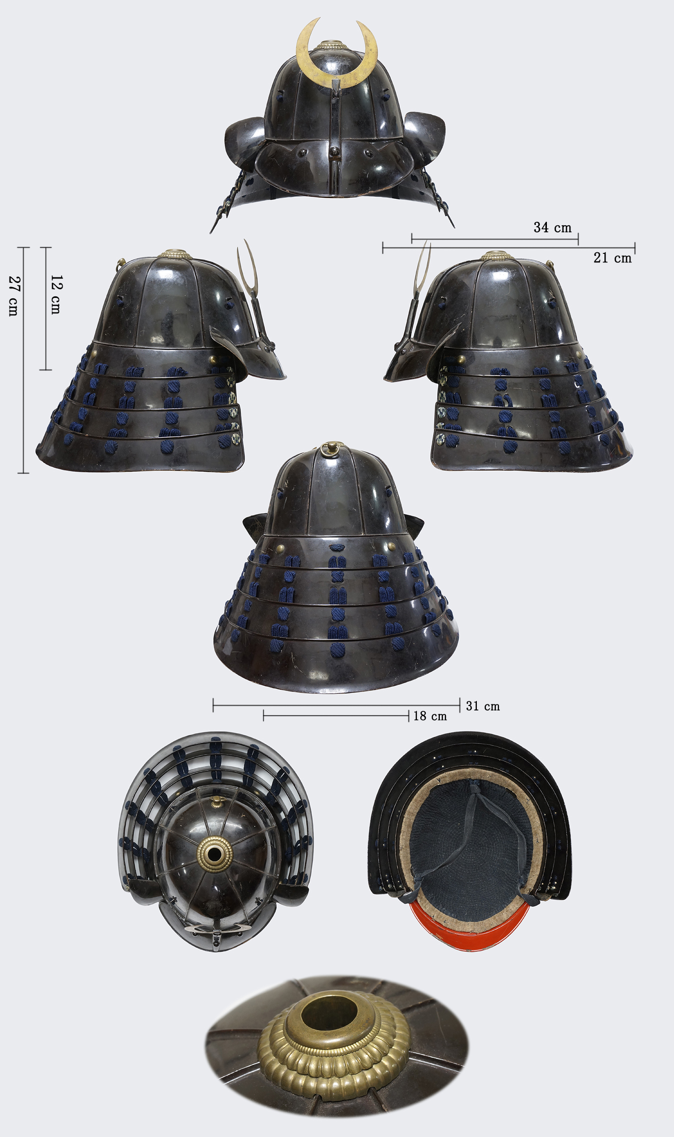 16 plates Suji Kabuto Mei (signature) : Mumei Jidai(era) : Edo period Special feature : 16 Kan Tetsusabi-iro nuri Suji-Kabuto, on the Fukikaeshi family crests is engraved. Tenpen-ana is made of copper, Shikoro is Tetsu Kurourushinuri Itamono 5 plates. This ...