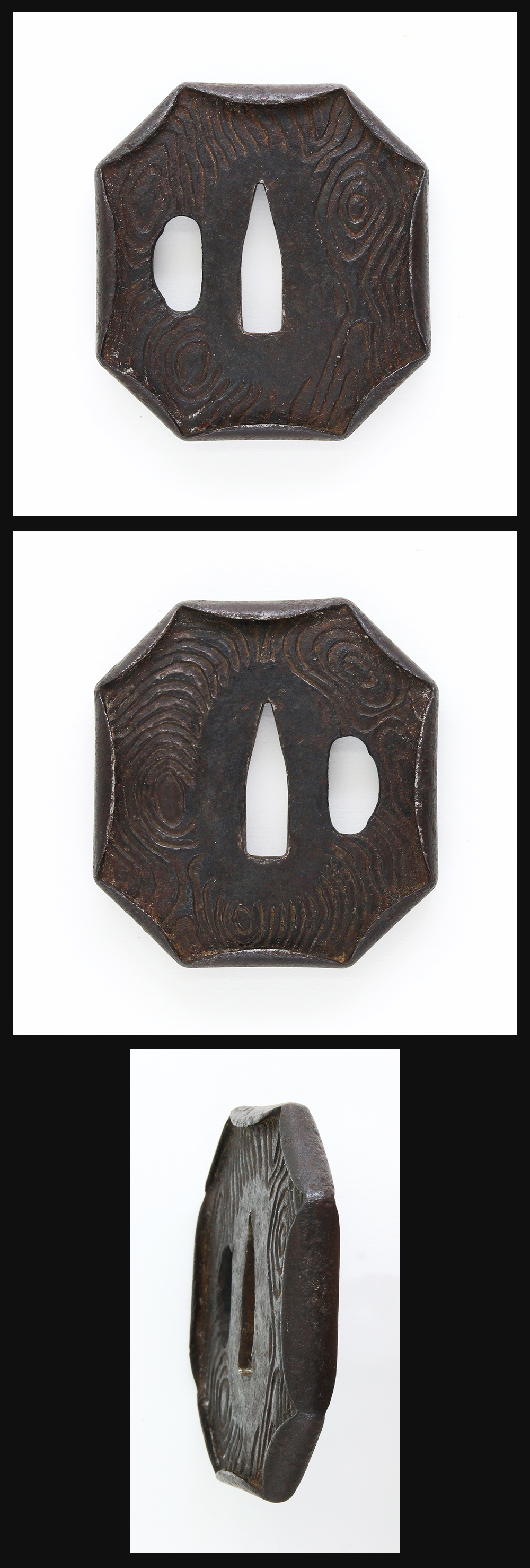 Special feature : Eight side iron tsuba with wooden pattern engraved. The rim is Uchikaeshi style.