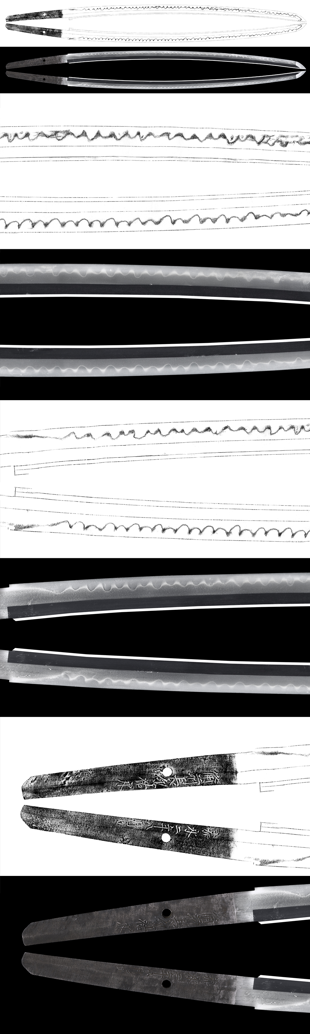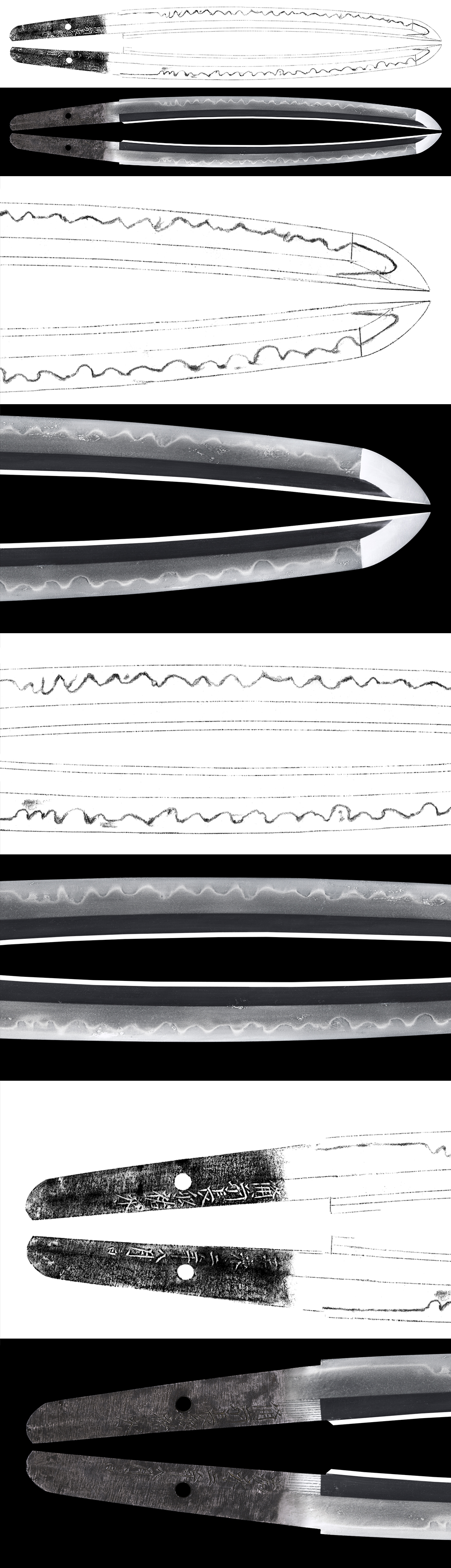 Hamon : Nie structure starting from suguha at the hamachi and gradually becomes gunome midare. Boushi is round end.