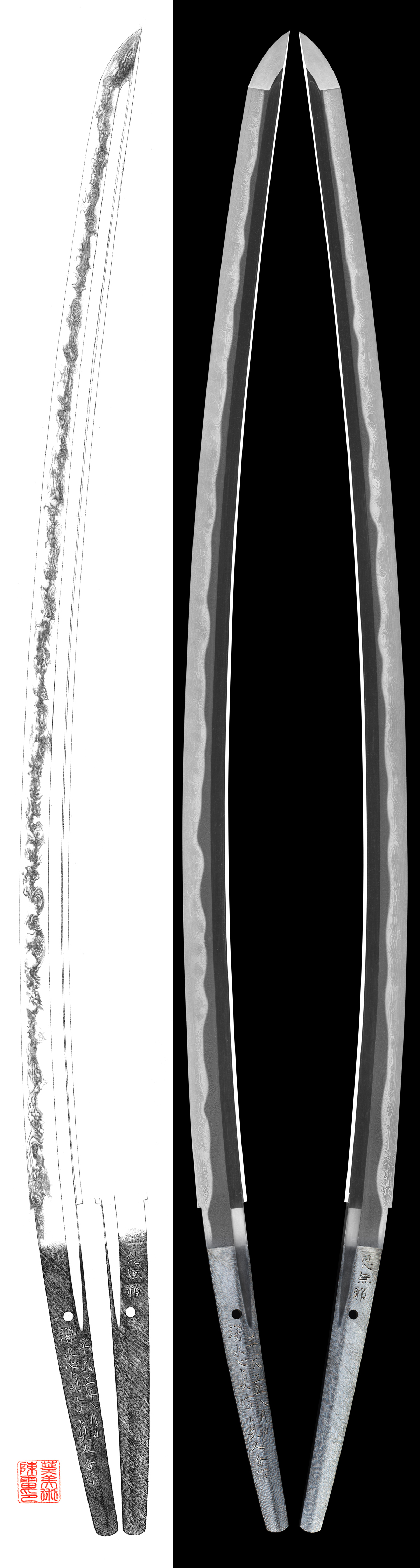 Shape : Wide and thick with deep Sori and long Kissaki. On both side, there Bo-hi.