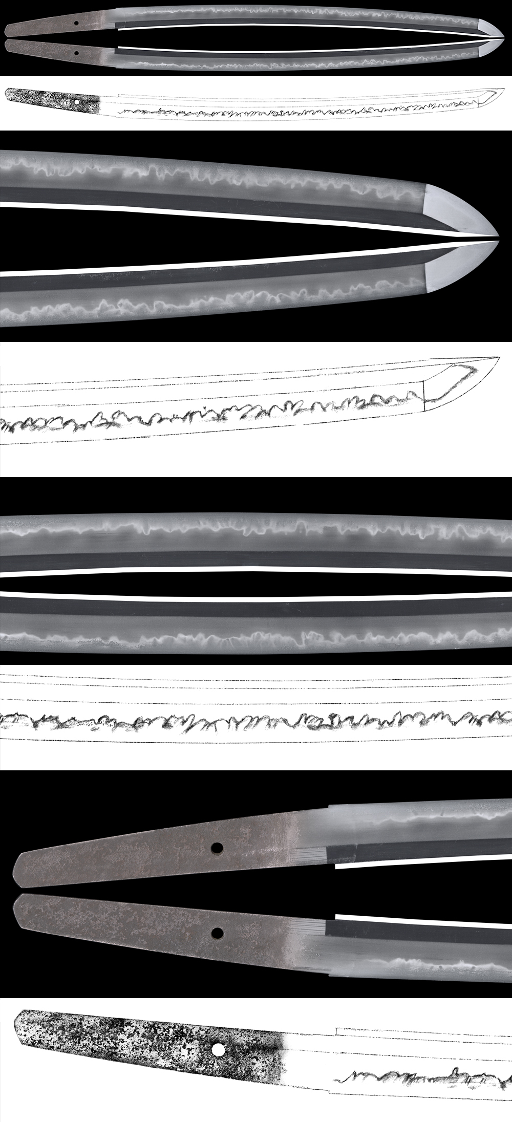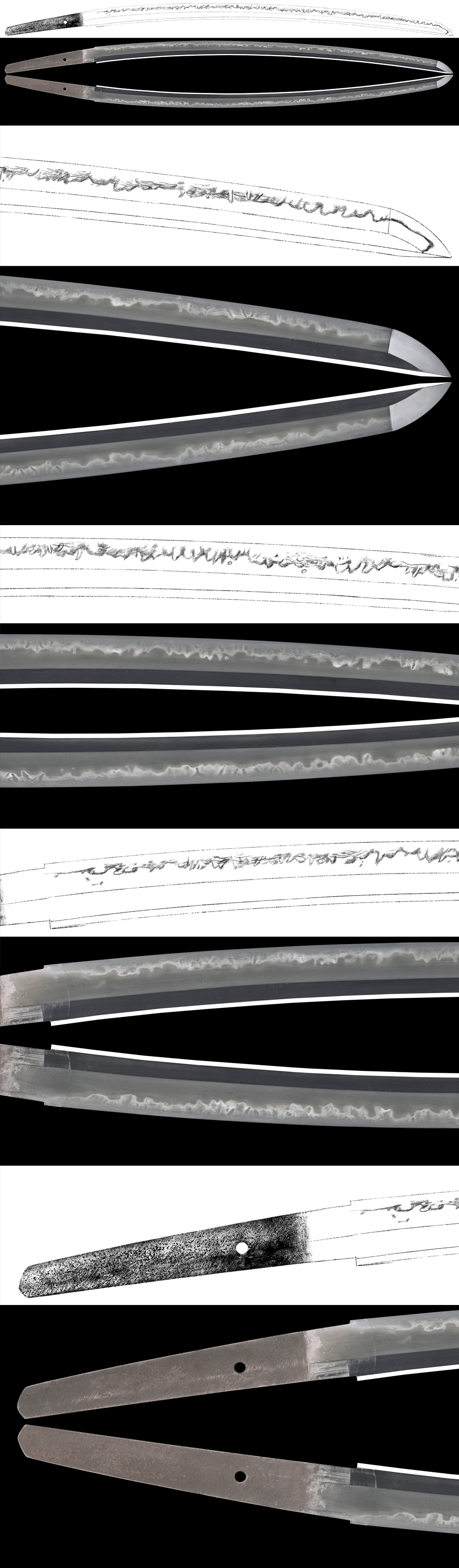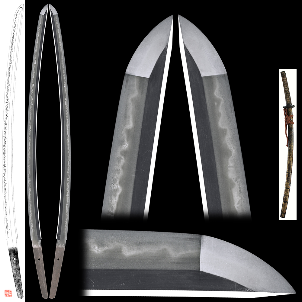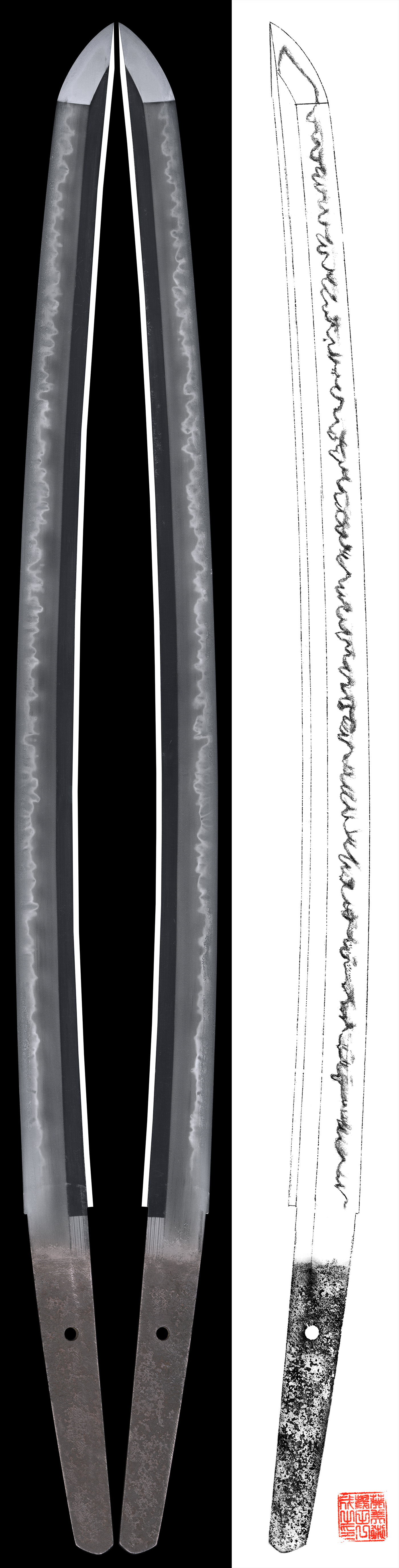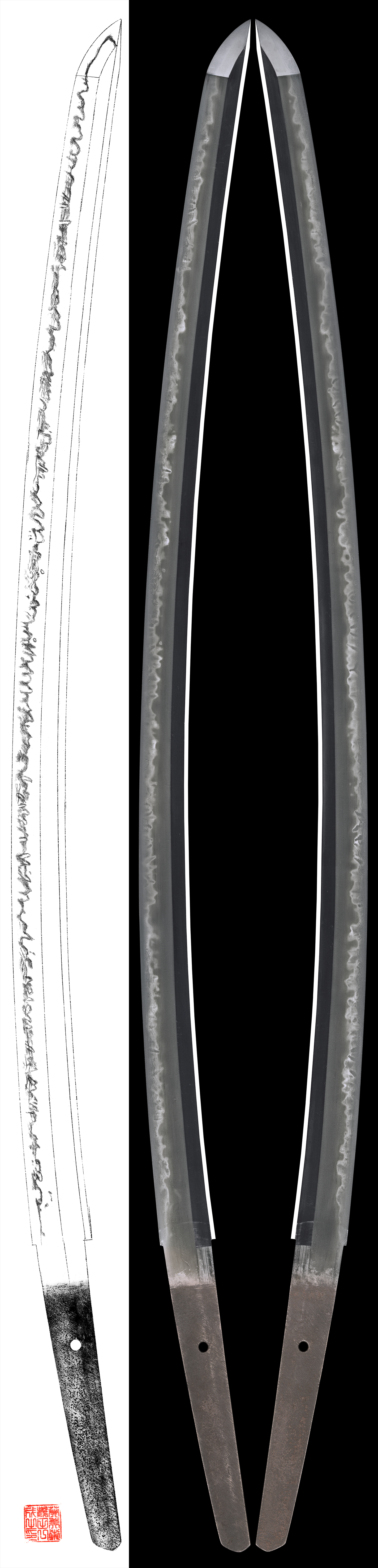 Shape : Wide and thick blade with Sori. Kissaki is rather long.