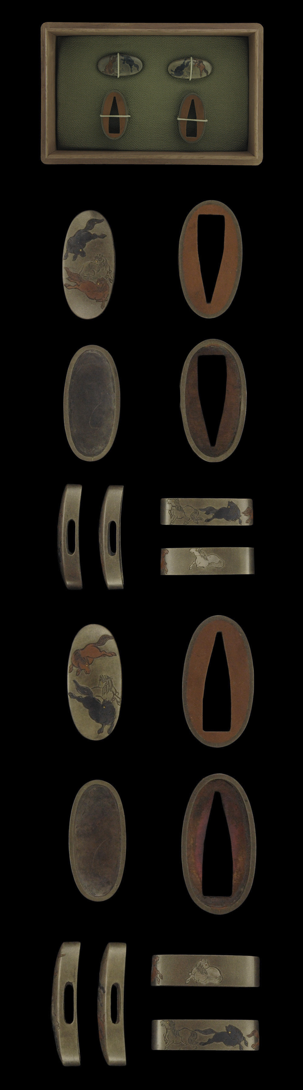 Special feature : On the Oboro-gin plate, The courser are engraved with Katakiri-bori, and them are engraved with silver, Shakudo, suaka cooper iroe.The eye of courser are engraved with gold iroe.