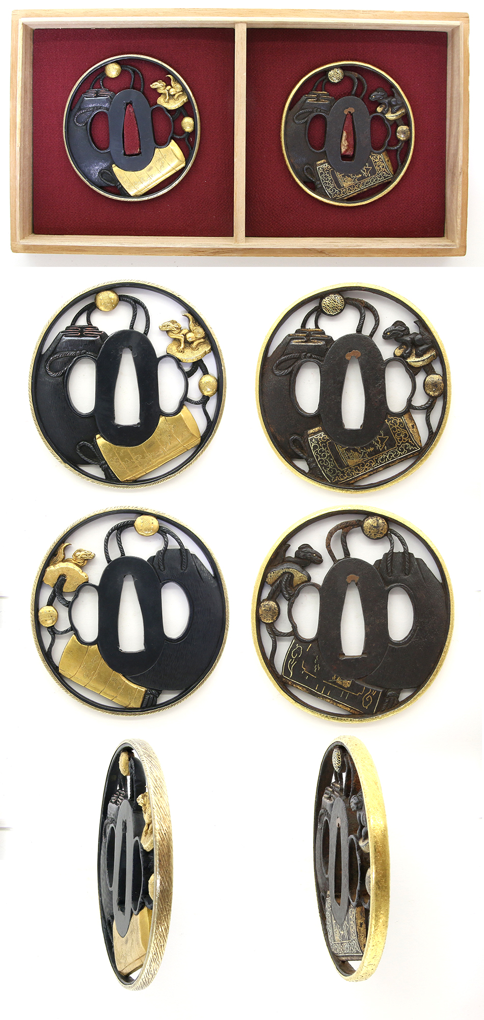Special feature: Inro and small bag are engraved with gold color with gold rim. Dai is made from Shakudo and Sho is made from iron.