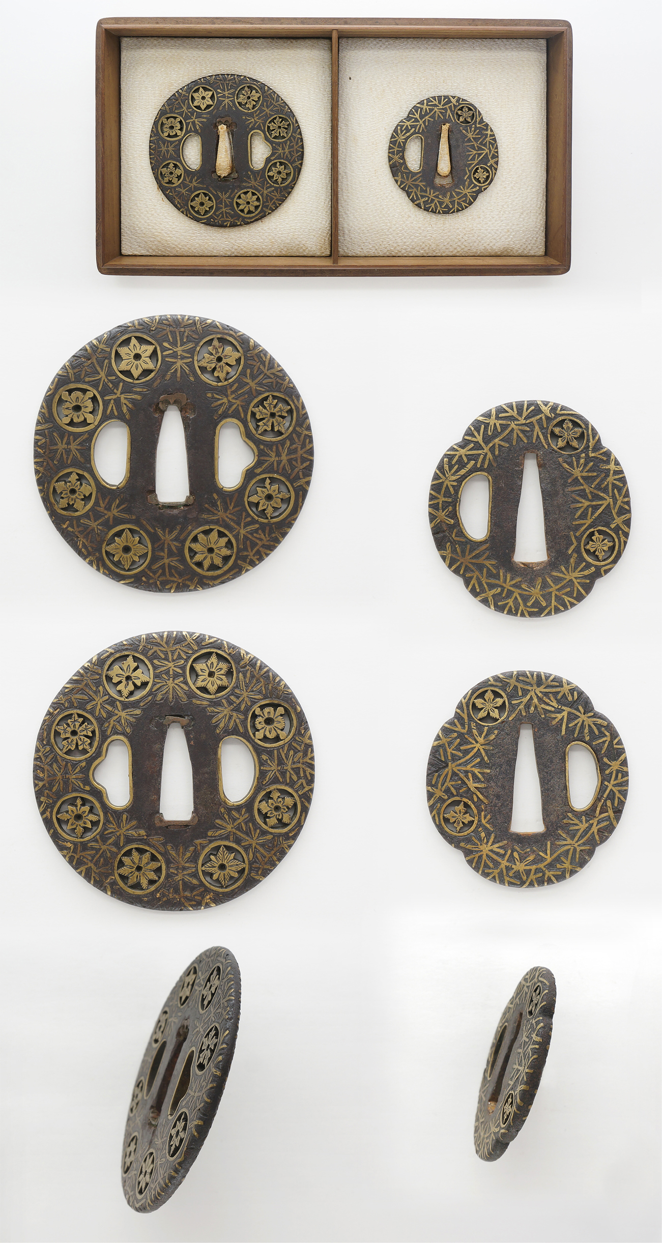 Daisho Tsuba: Mei (signature) : Mumei(Unsigned) Dai(large): Length : 7.54cm x 7.18cm ( 2.97 inches x 2.83 inches) Thickness of rim : 0.44cm ( 0.17 inches) Weight: 157 g Sho(small): Length : 7.29cm x 6.36cm ( 2.87 inches x 2.50 inches) ...