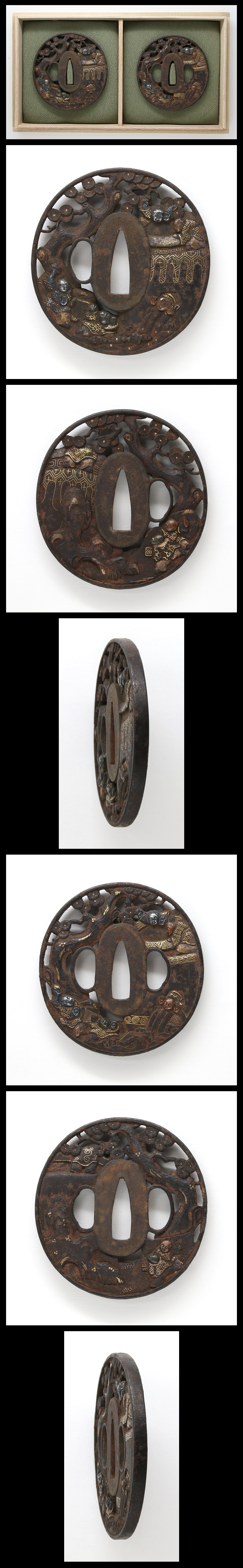 Special feature: Round shape iron tsuba with design from the famous Chinese anecdote of Shiba Onko is engraved and inlayed with gold in cloth pattern. While children were playing around one of them fall into a water jar. To save the drowning friend, one smart one saved him by cracking the jar and saved his life. The one who saved was the Shima Onko who is a famous confucian at the time.