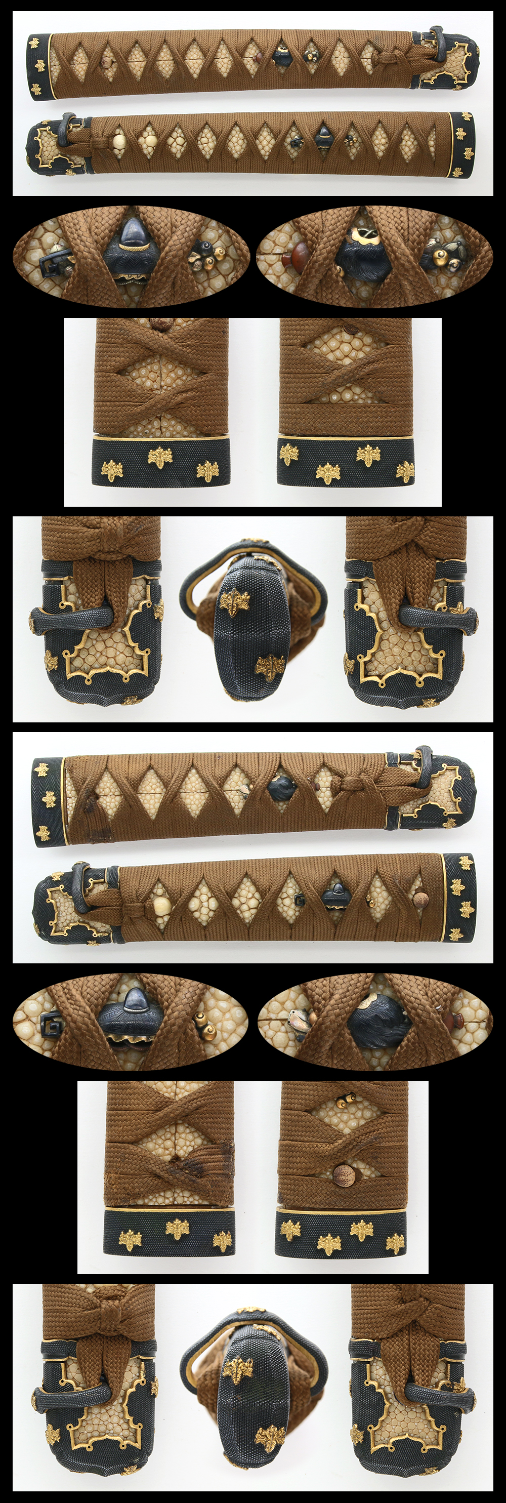 Special Feature: An elegant brown tsukaito and Kirimon metal work tsuka for Gunto koshirae .