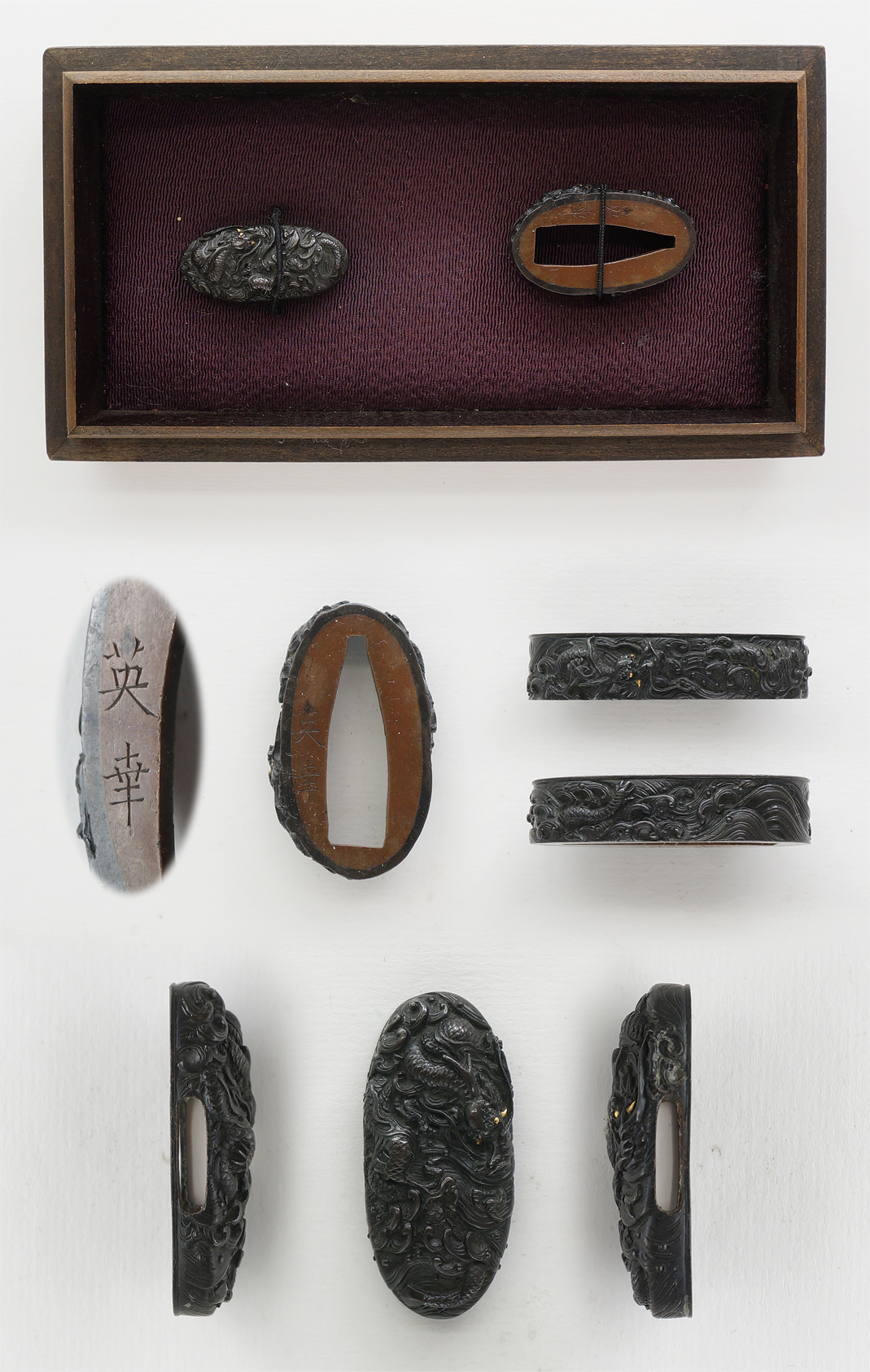 Special feature:Shakudo plate with wave and dragon design engraved and inlaid with gold. It is fully engraved with fine curving.
