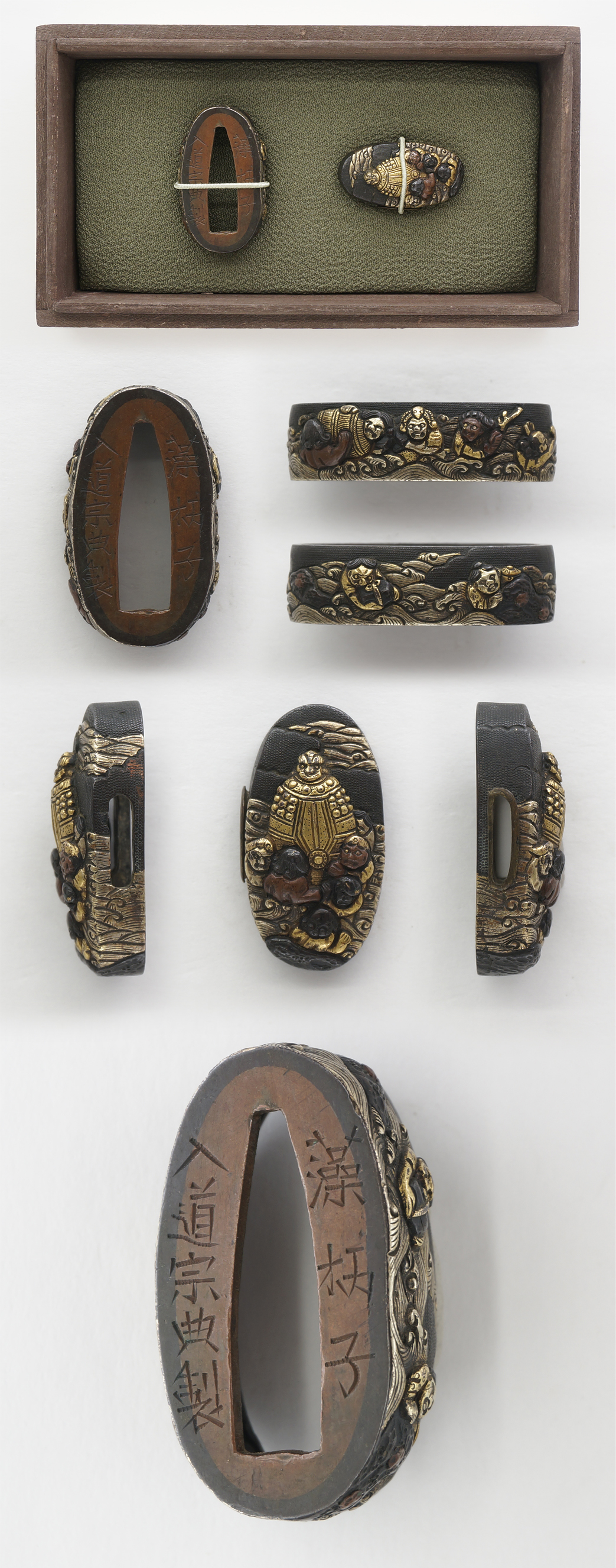 Special feature:Shakudo nanakoji plate with Tsurikane(temple bell) and men design engraved and inlaid with gold, silver and copper.