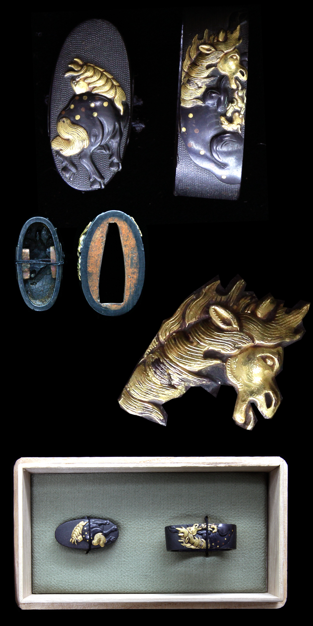 On the kashira, mother horse is engraved and inlayed with gold.