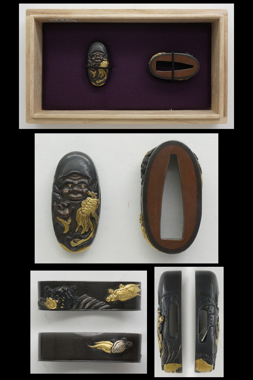 Ordering Number:F13383 Fuchi Kashira: Mei (signature) : Mumei (unsigned) Fuchi Length : 3.89cm x 2.11cm x 1.26cm (1.53inchs x 0.83inches x 0.49inches) Kashira Length : 3.46cm x 1.72cm x 1.19cm (1.36inchs x 0.68inches x 0.47inches) Jidai(era) : Special feature: Shibuichi ...