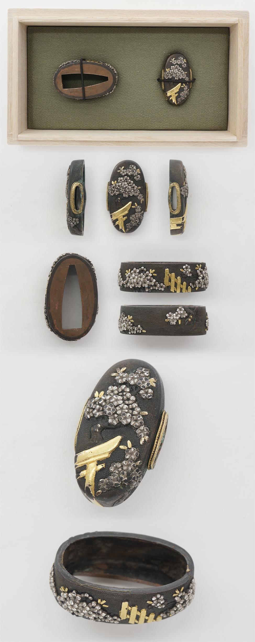Fuchikashira Mei (signature) : Mumei Length : 3.84cm or 1.51inches × 1.63cm or 0.64inches Jidai(era) : Edo period. Special feature : On the Syakudo Nanako plate, Himawari(sun flowers) are engraved with gold color. This is nice design. AOI estimation paper. ...