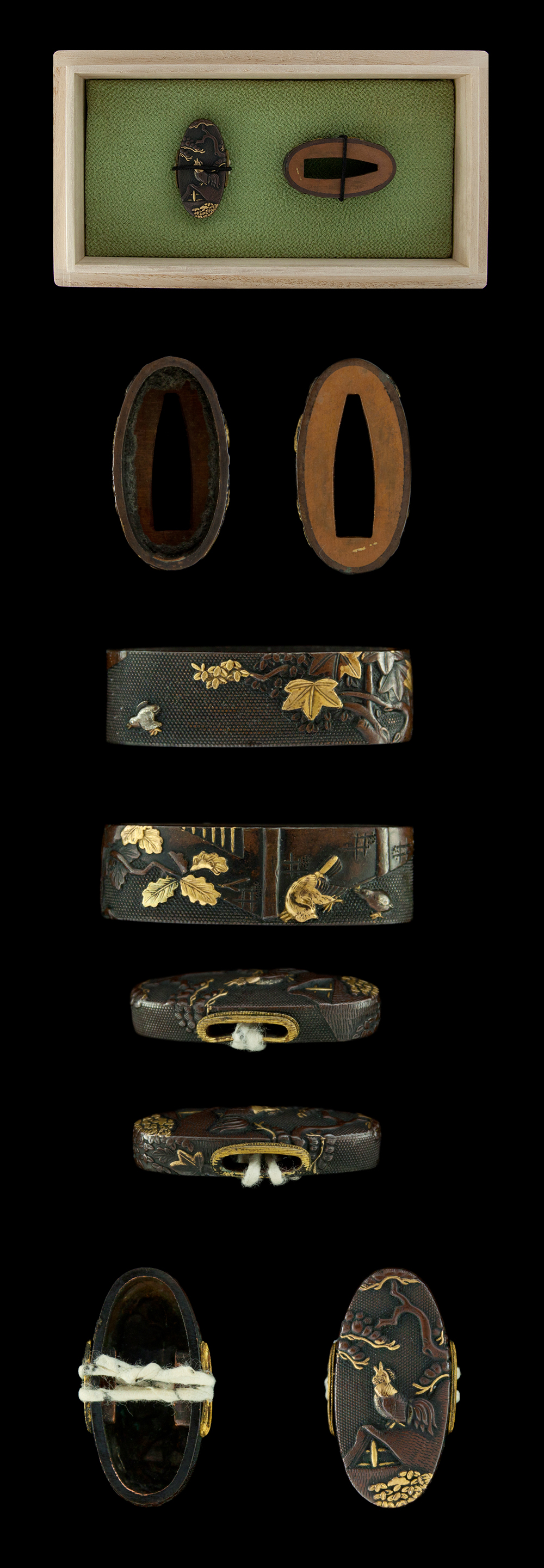 Special feature:On the Shakudo-nanako plate, Parent-child chicken are engraved with gold color spot iroe.