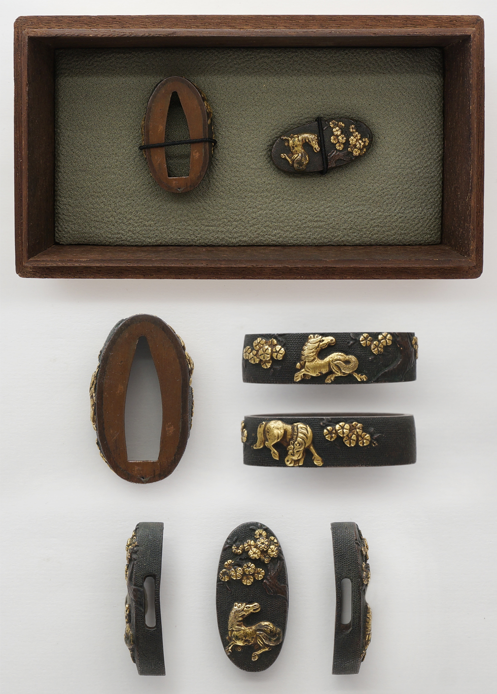 Special feature: Shakudo Nanako plate, horses and cherry blossoms are engraved with gold color.