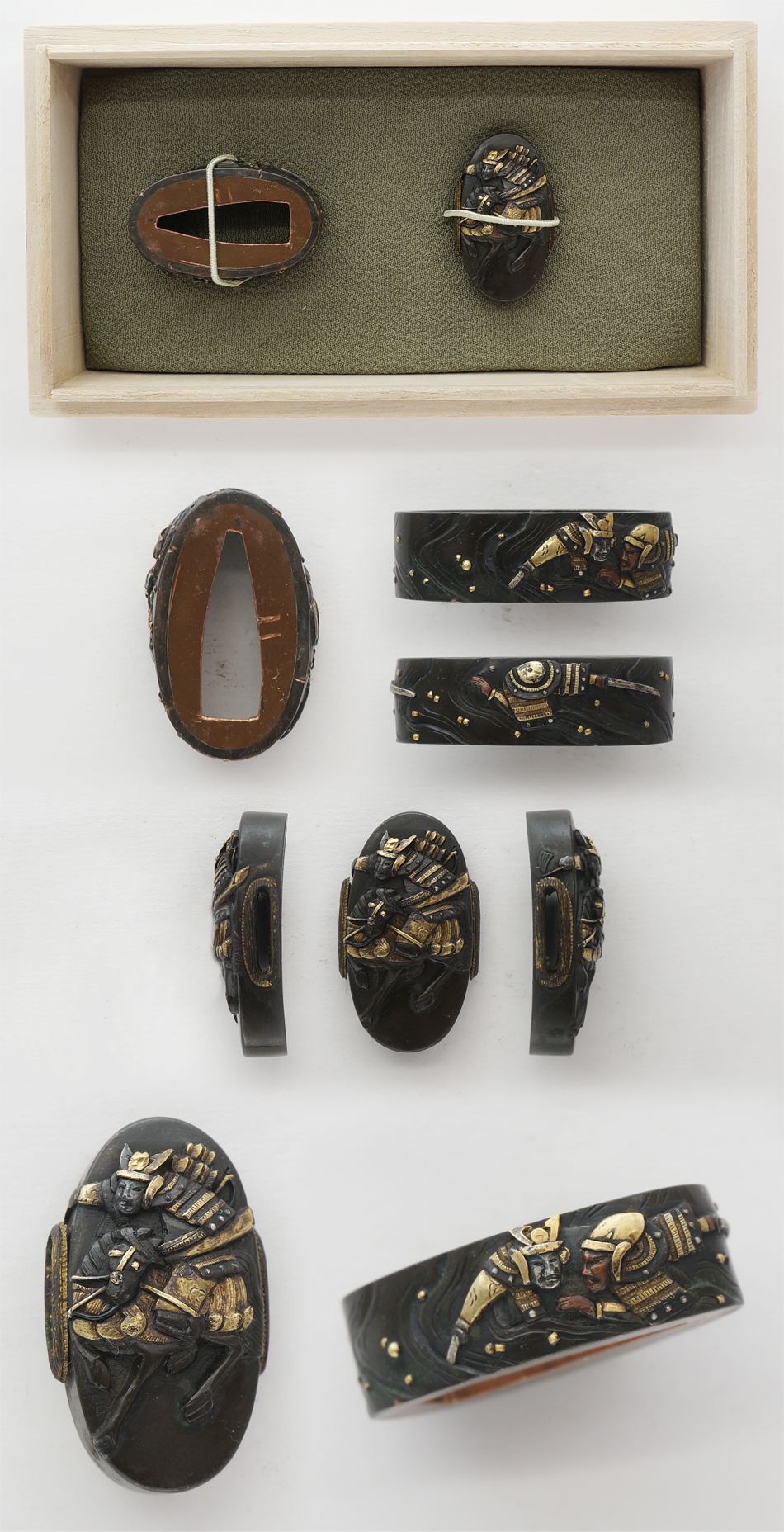 Special feature: Samurais(battle design) are engraved on Shakudo plate, inlayed with gold, silver and copper color.