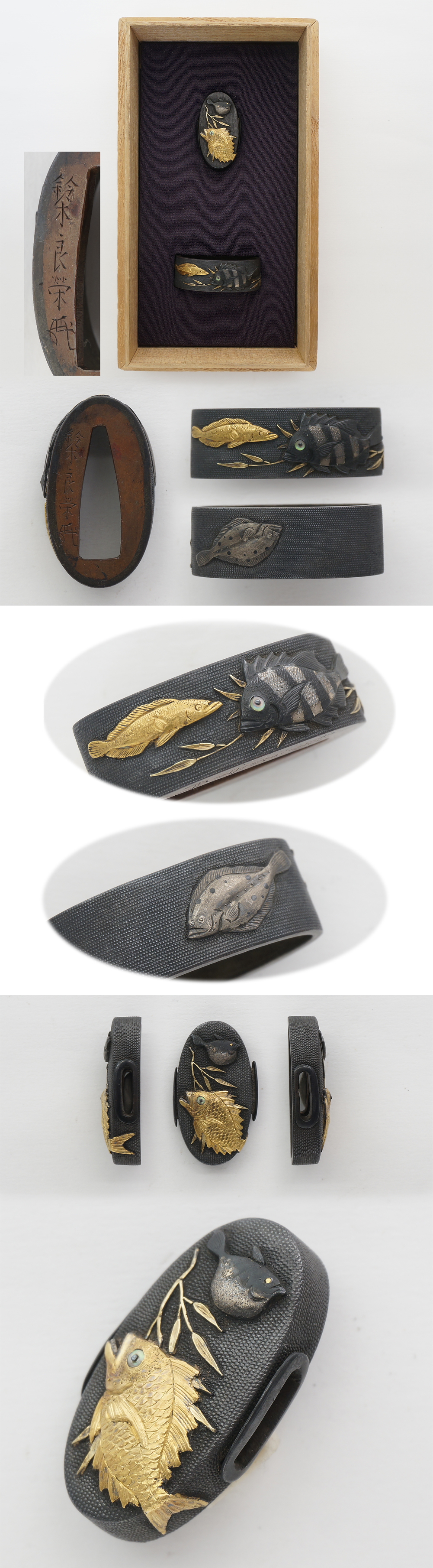 Special feature : Shakudo nanakoji plate with fish design engraved and inlaid with gold.
