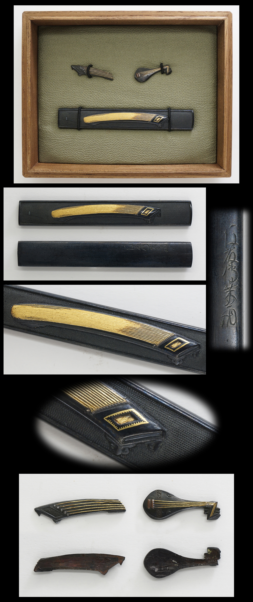 Special feature : On shakudo nanakoji plate, guqin and biwa is engraved, and string is inlayed with gold.