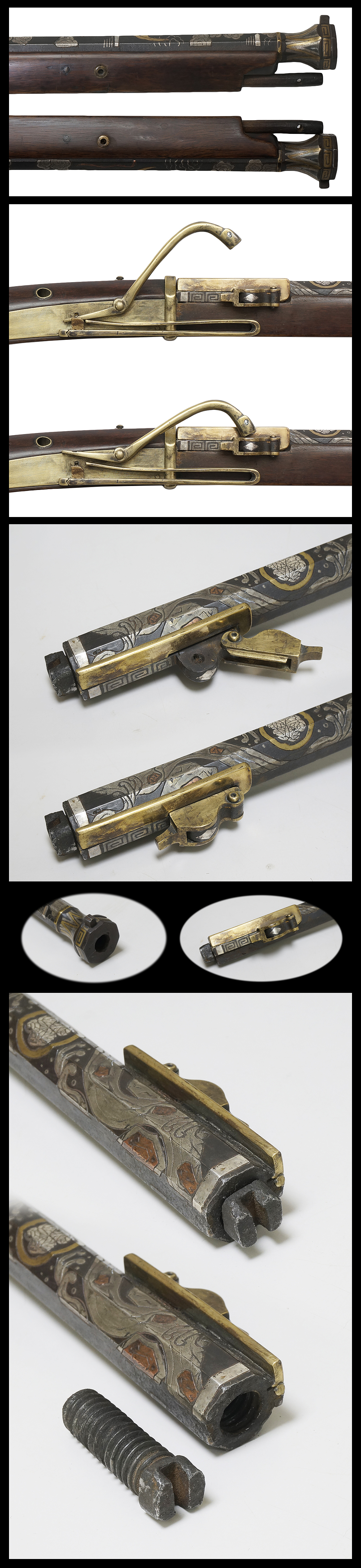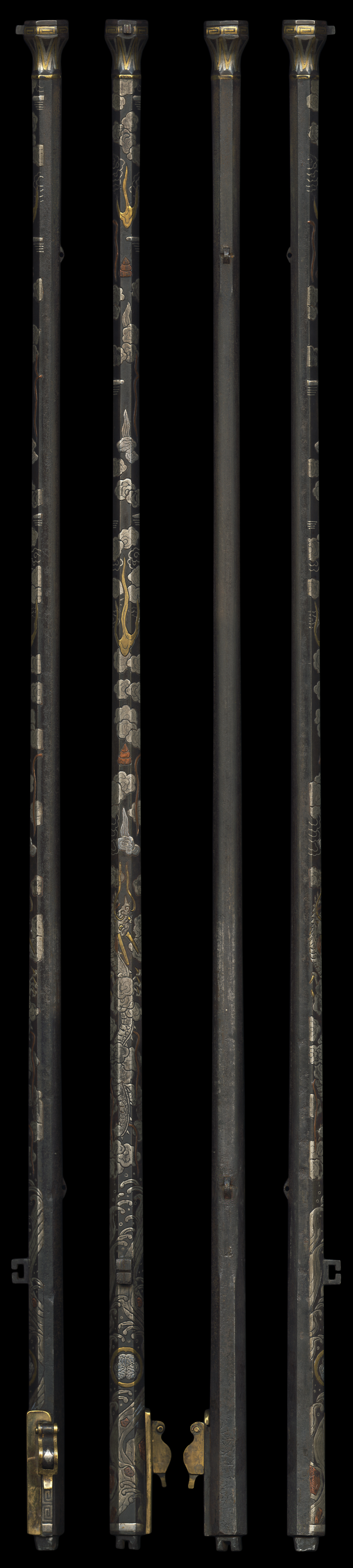 On the gun, dragon and clouds are engraved and inlayed by gold, silver and copper plate. The stand is made from high quality oak. Because it is cherished for long period, the color has drop into dark brown.