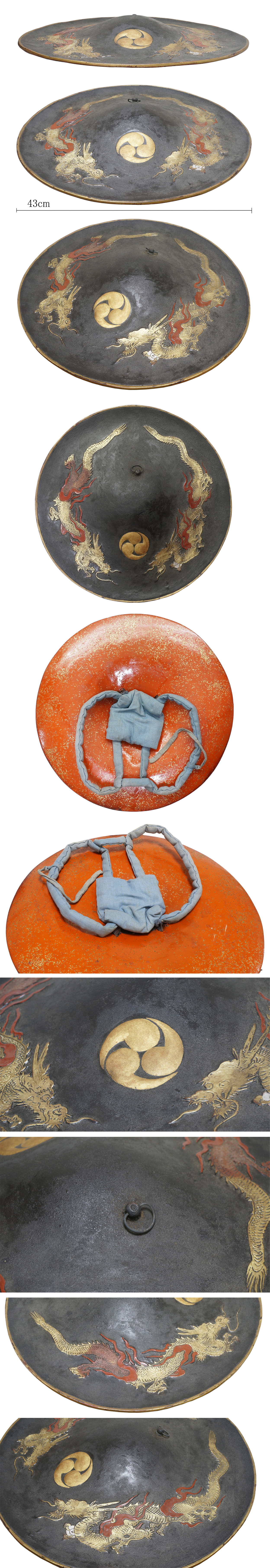 HOME > Armor > Armor Jingasa : Mumei 2016/01/14 2017/01/28 Jingasa Mei (signature) : Mumei Jidai(era) : Unknow Special feature : There is a family crest engraved at the front. This Jingasa is considerably larger diameter 43cm. AOI estimation paper Price : 45,000 JPY- -Armor