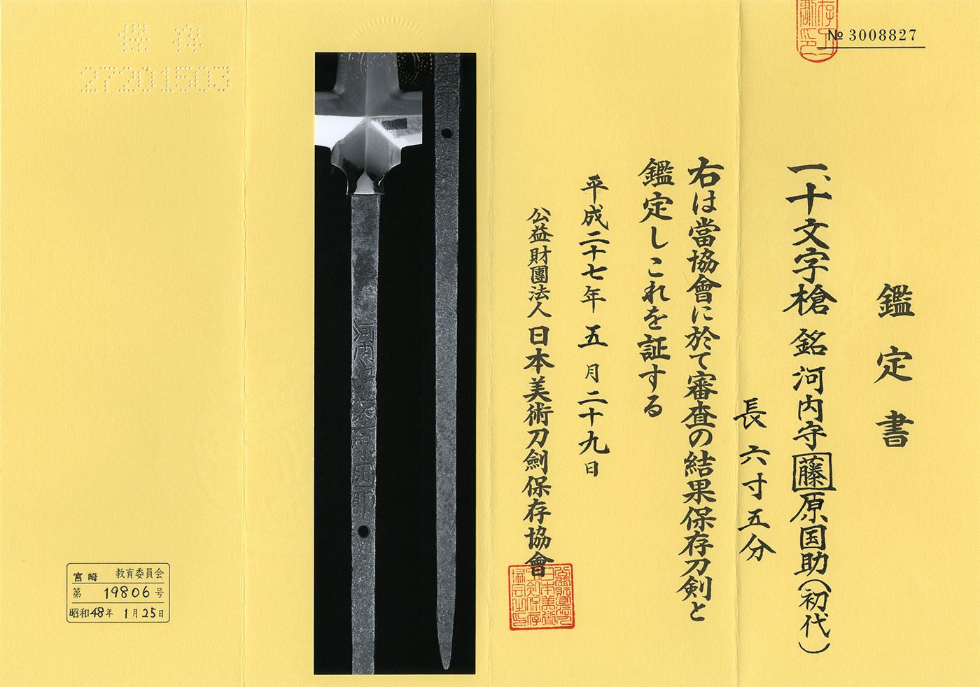 Jumonji Yari: Kawachi Kami Fujiwara Kunisuke (first generation)