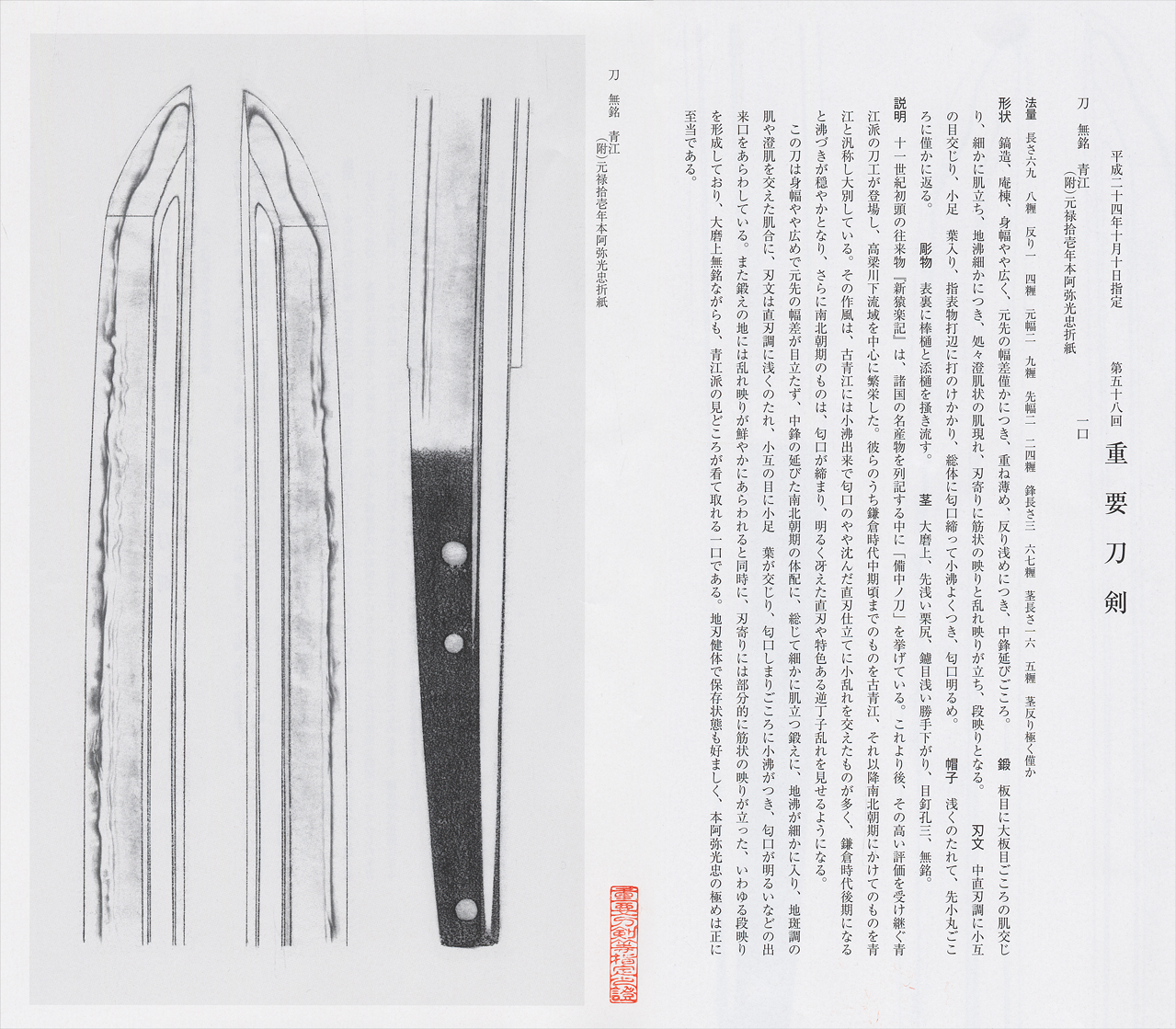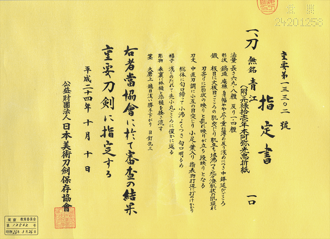 According to the Jyuyo zufu, the blade is healthy and good keeping blade from ancient period and also the Kantei of the Kocyu Origami is quite right.(58 Jyuyo Zufu)