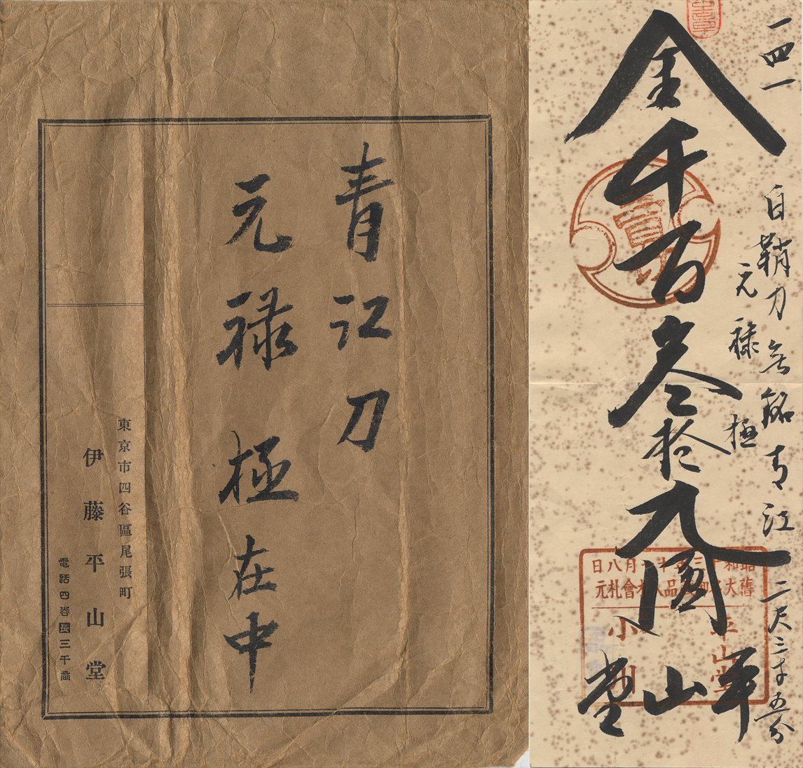 The sword accompanied with Kocyu origami which is very precious paper and also Heizando's receipt.