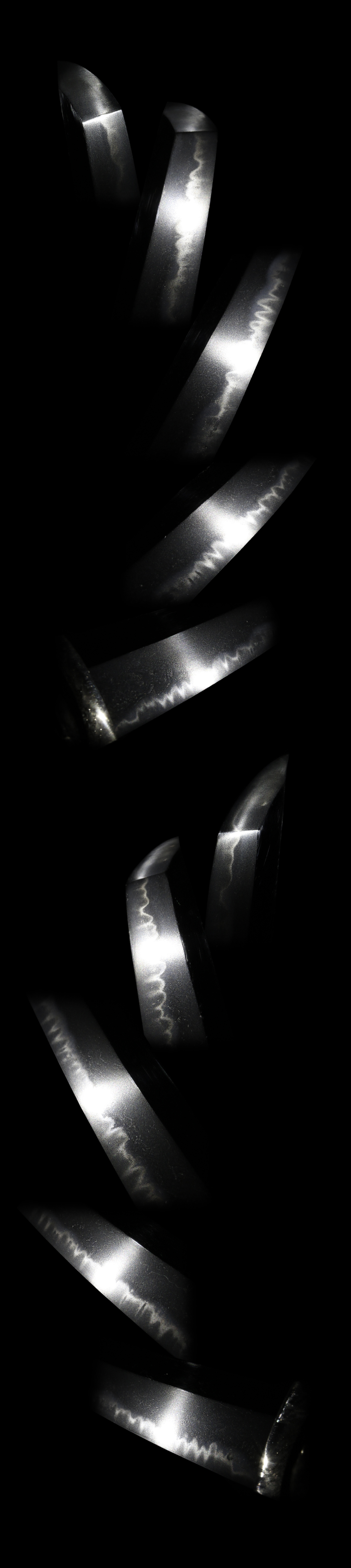 Hamon : Nie Deki Gunome Midare. There are many Ashi.