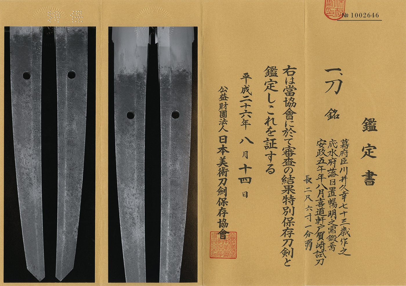 Mito family's samurai Heki Cyomei ordered the sword to Kawai Hisayuki and after that well known samurai Togasaki Kidoken who was a expert of the Shindo Munenryu tried cutting test.