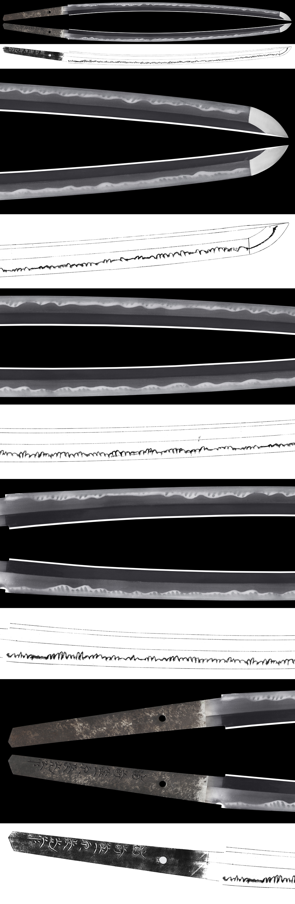 Hamon : Nioi Deki Choji Midare with Ashi attached. Boshi tip is round end.