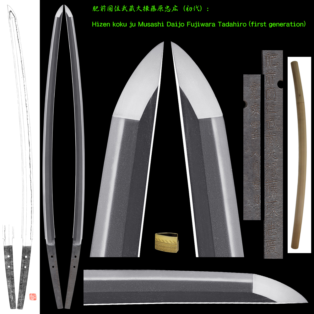 Special feature : Tadayoshi the First, born Hashimoto Shinzaemon was a swordsmith of Hizen province, present Saga pref. in Kyushu Island. Both his father and grandfather passed away when Tadayoshi was 13 years old so Tadayoshi learned under Dotanuki Zenbei in Higo province, present Kumamoto pref. Tadayoshi and Munenaga went to Kyoto to learn under the Umetada School in 1596. Tadayoshi learned forging sword and Munenaga learned the carving. They returned in 1598. Tadayoshi worked as a retained swordsmith of the Nabeshima family in the domain of Saga. Tadaysohi's first sword inscribed the date was forged in 1600 at the age of 29. He changed the name to Tadahiro at the occasion of approved as the Musashi-Daijo in February 1624. Tadahiro (Tadayoshi) passed away in 1632.