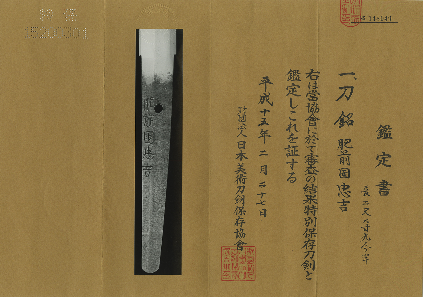 His sword was ranked as a Saijyo-saku O-wazamono at the Shin-to period. The Hizen School placed extremely important position in the history of this period. The main Tadayoshi family and derived branches had been developed and prospared.