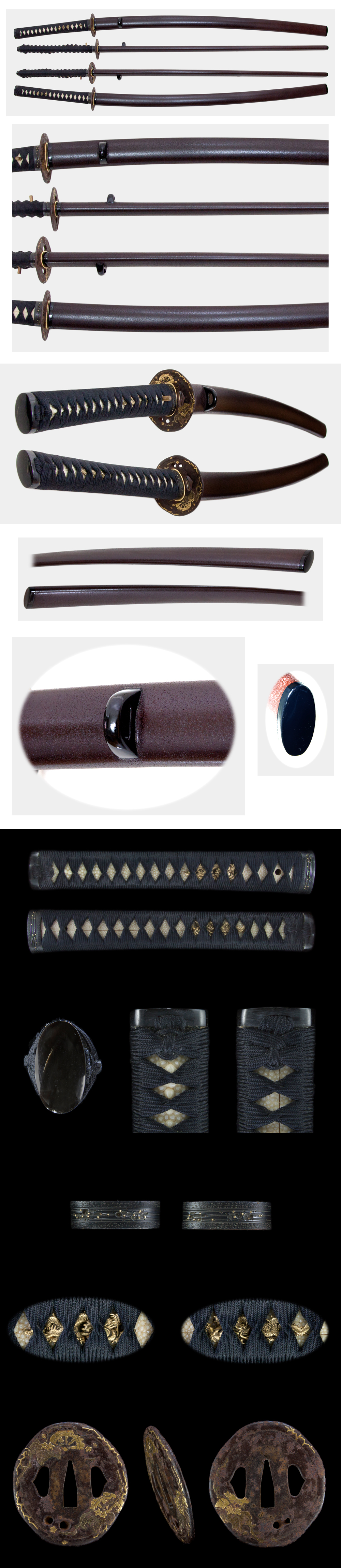 Tsuba : On oval shape iron tsuba, water wheel and flower design is engraved and inlayed with gold.