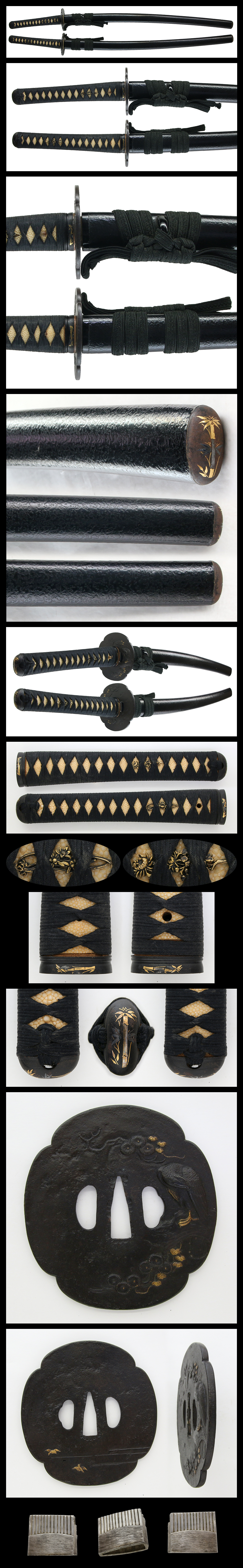 Tsuba : Mokko shape iron Tsuba, pine tree with raptorial bird are engraved with gold color.