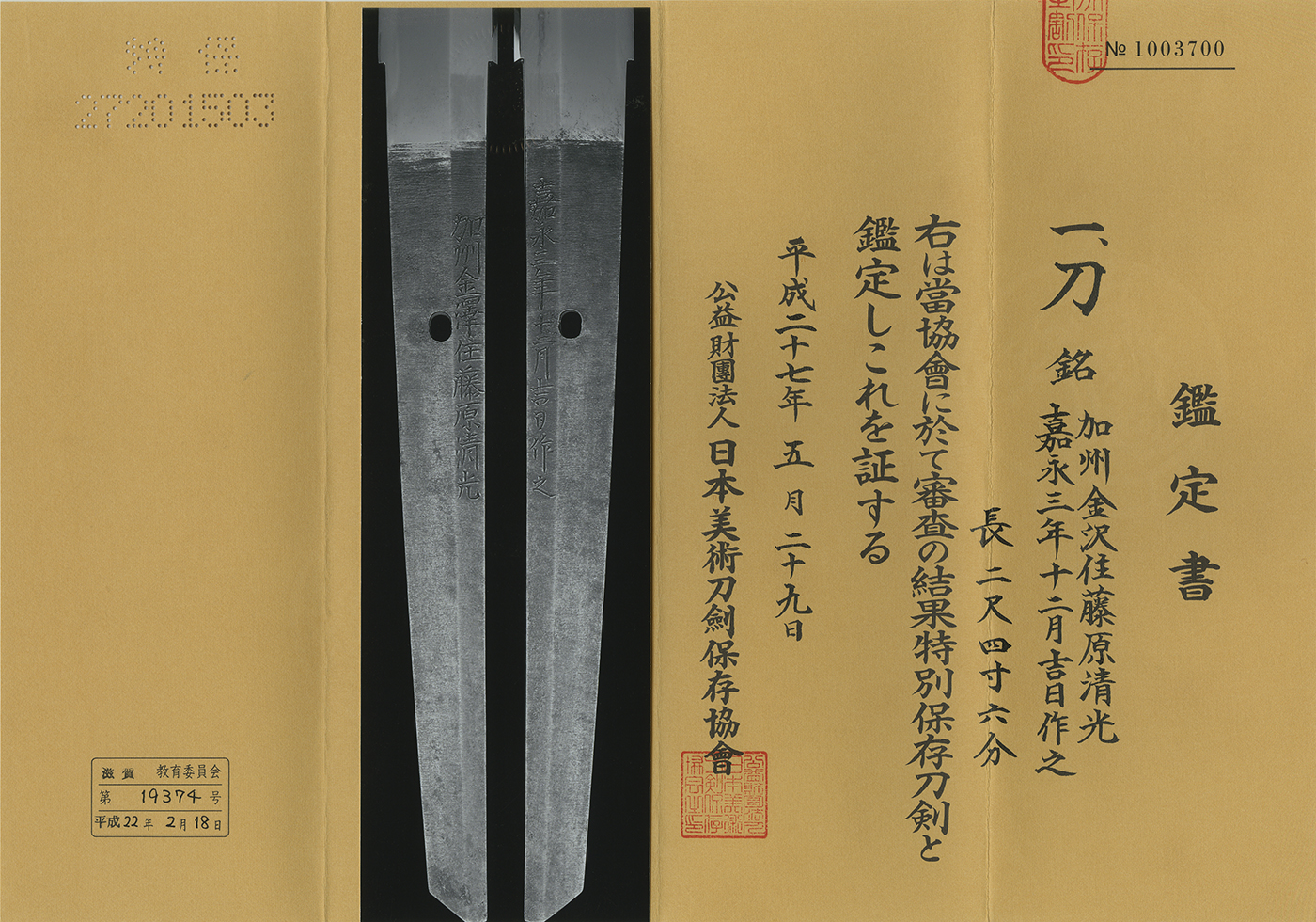 Katana : Kashu Kanazawa Ju Fujiwara Kiyomitsu/Kaei 3 nen 12 gatsu Kichijitsu saku kore