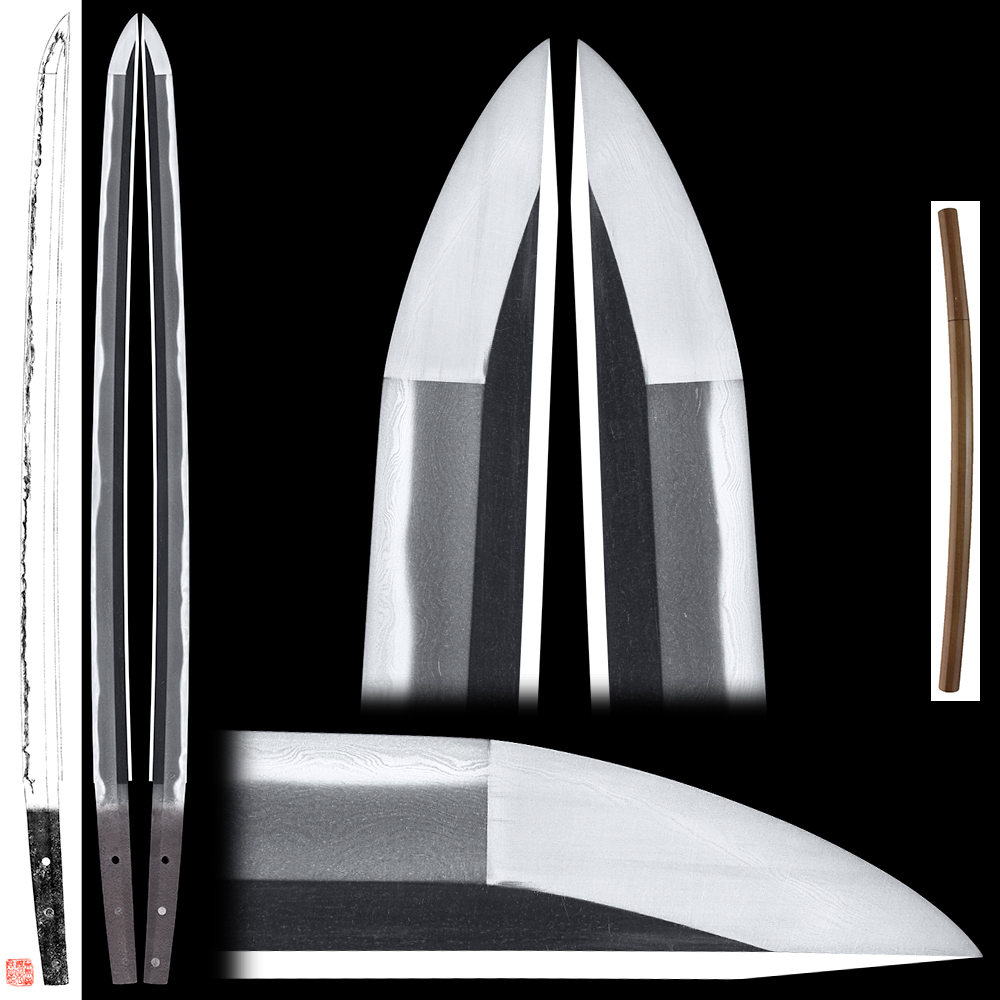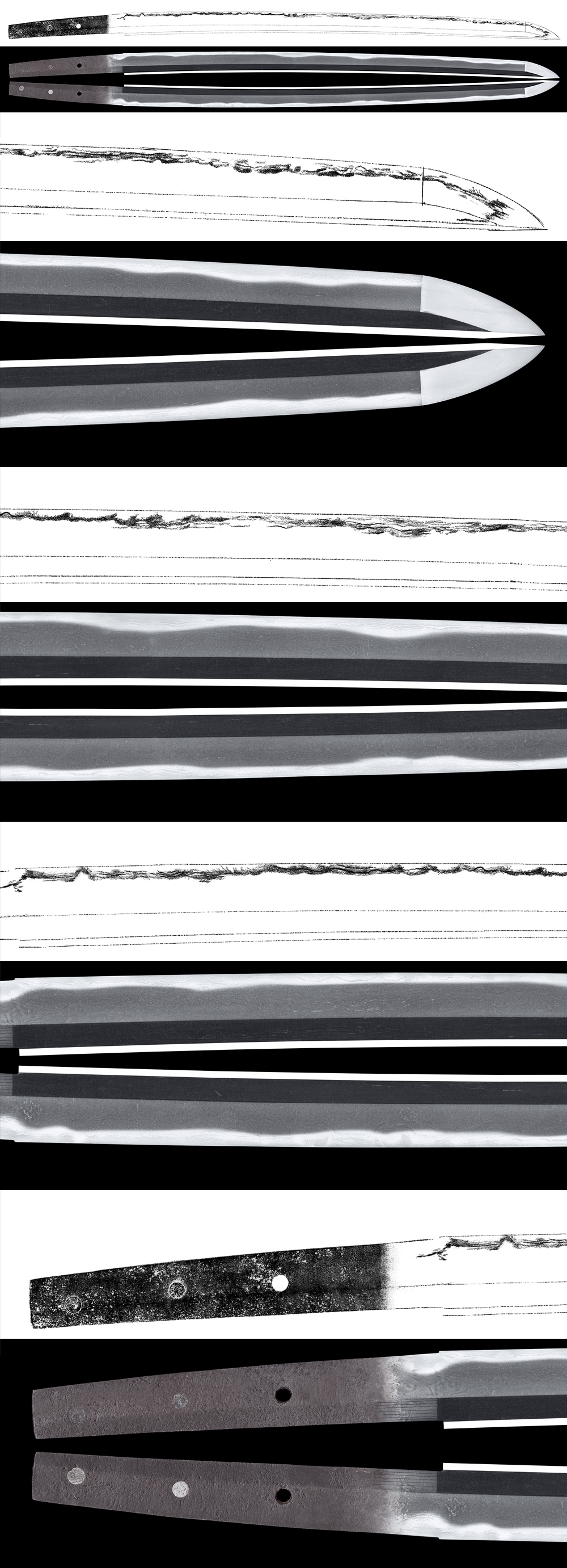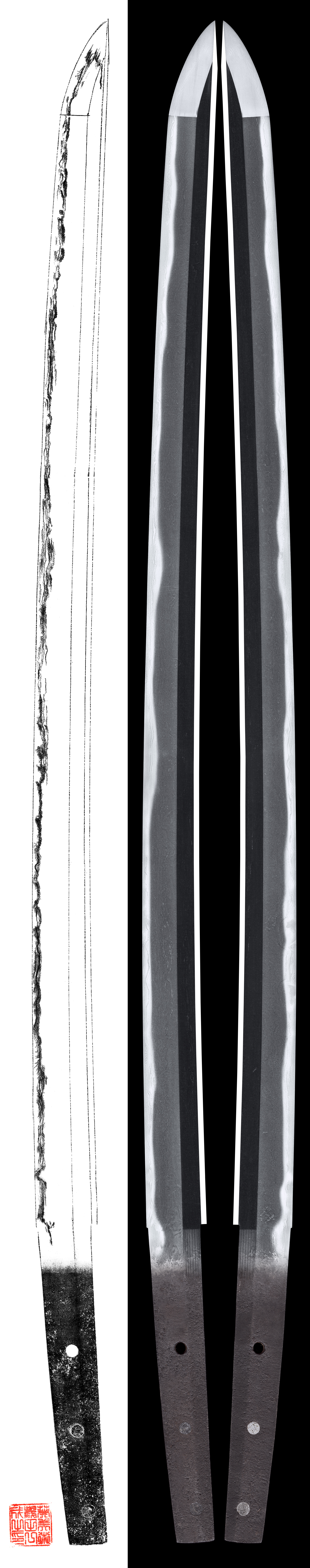 Shape : The blade is Osuriage Mumei (cut shortened) with small curve and long Kissaki.