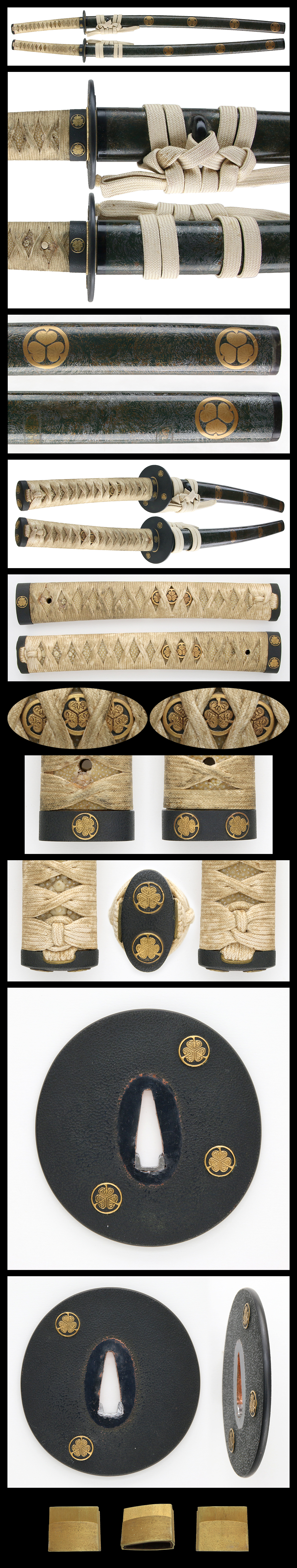 Menuki : Edo Shogunate crests carved on Shakudo Ishimeji plate inlaid with gold.