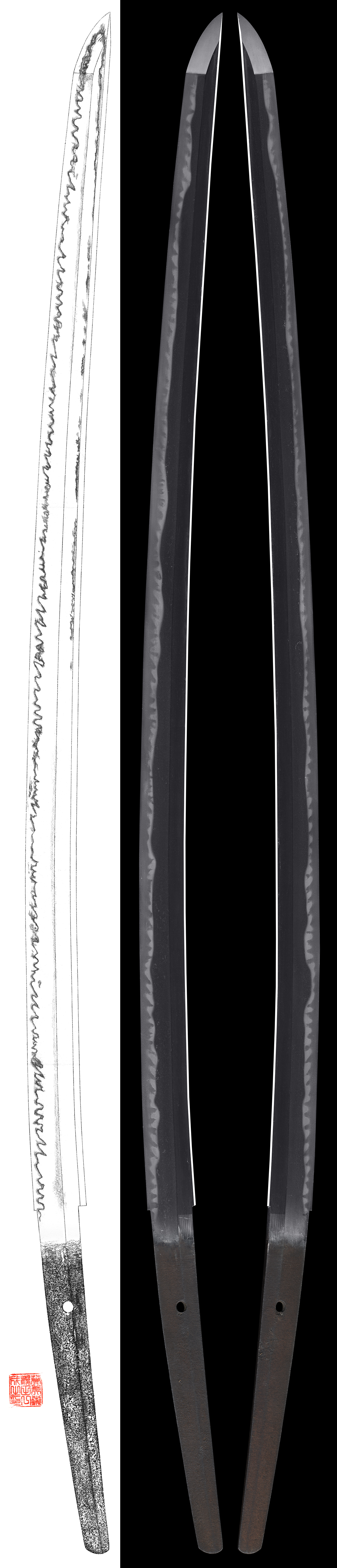 Shape : The shape is rather wide and thick with ample sori. It is long and tough looking katana.