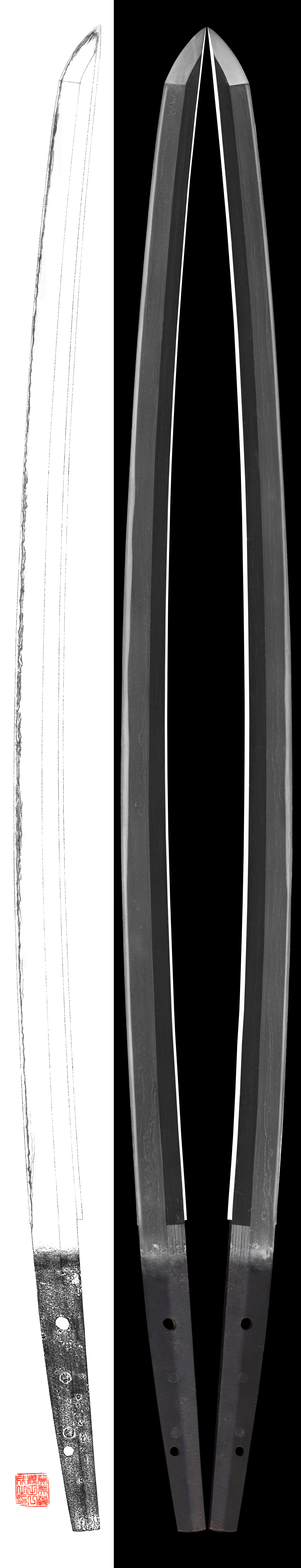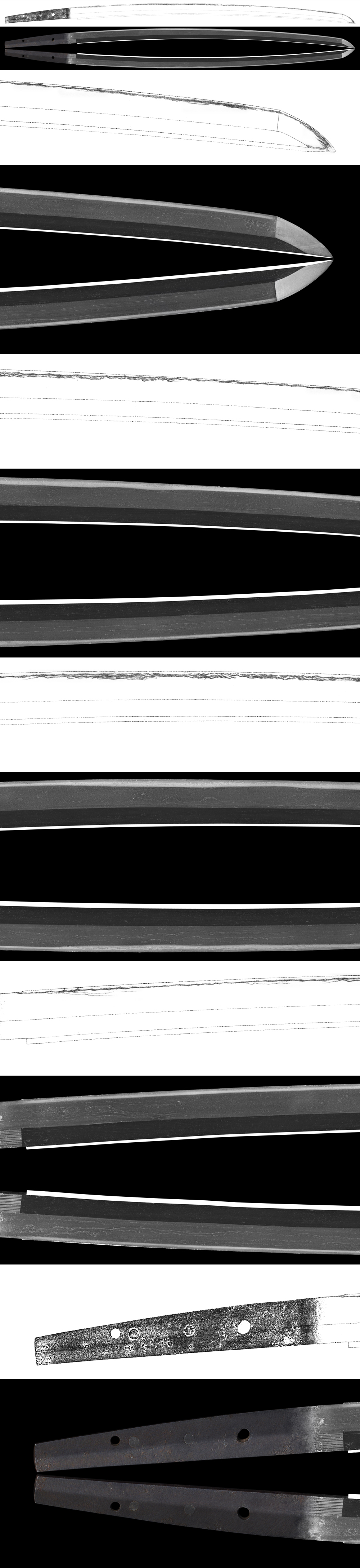 Shape : The blade is oosuriage mumei (cut shortened) wide and rather thick with suitable sori and long kissali nice looking taihao(shape),