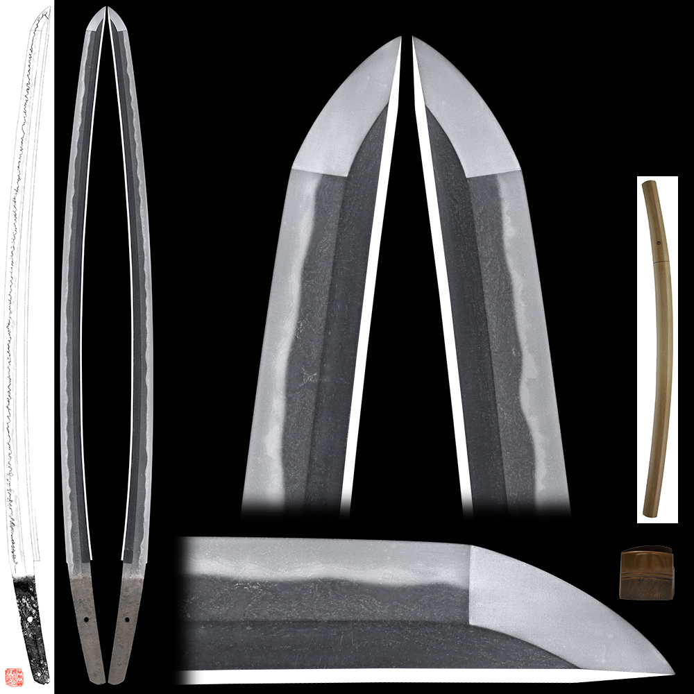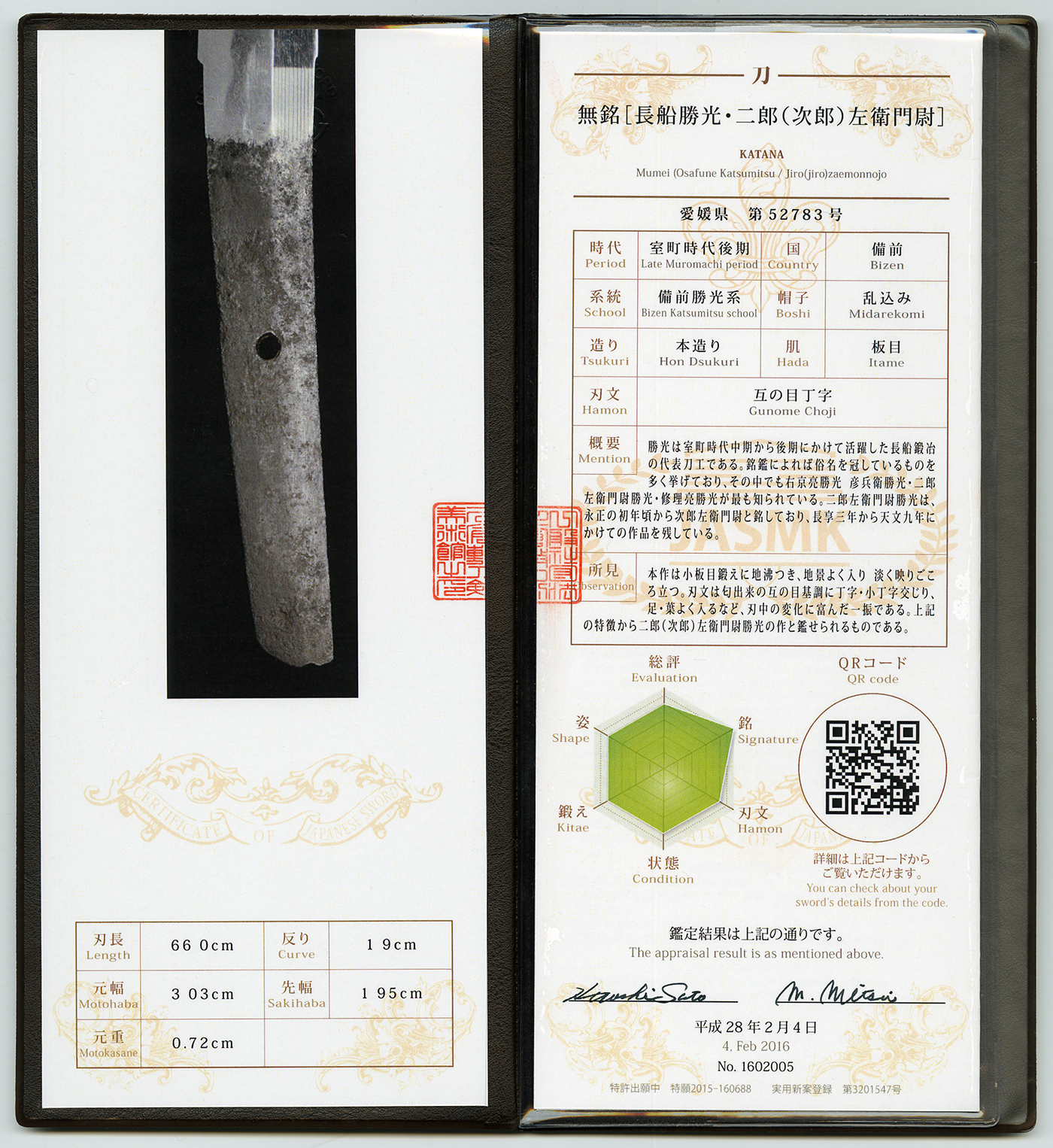 He was designated as a Ryowazamono and Saijyo saku ranking. This blade has the Kurashiki museum estimation paper.