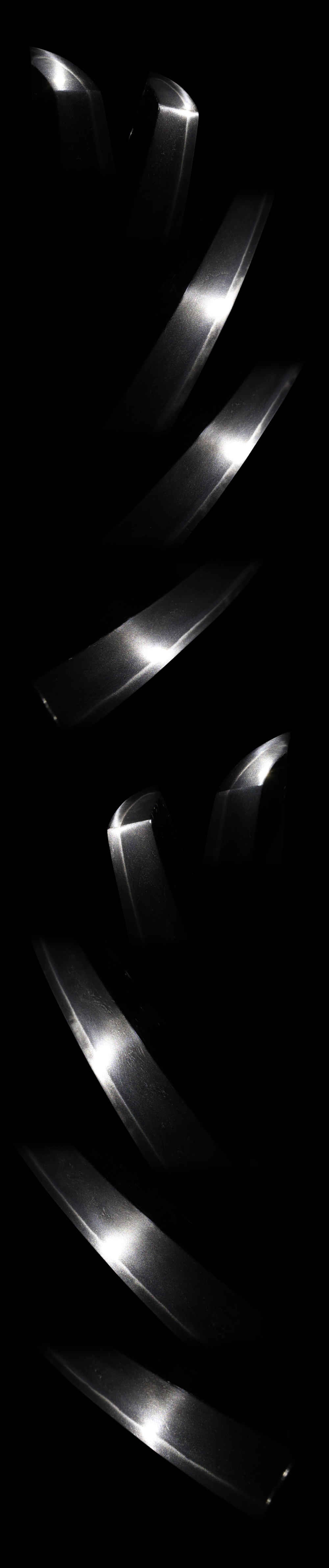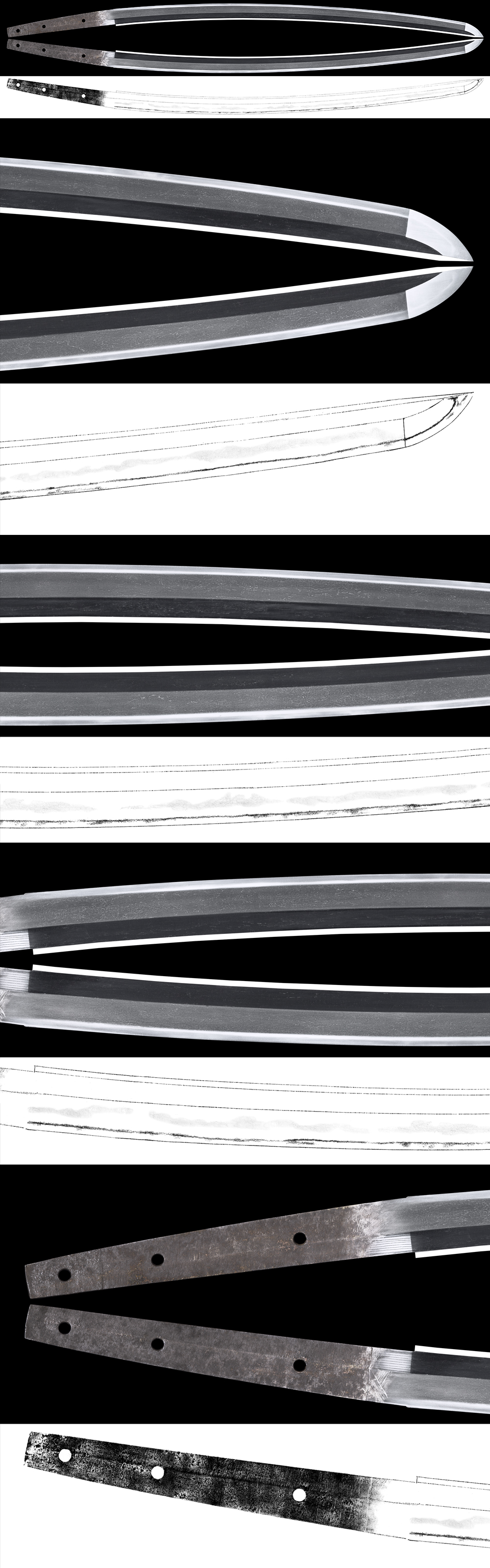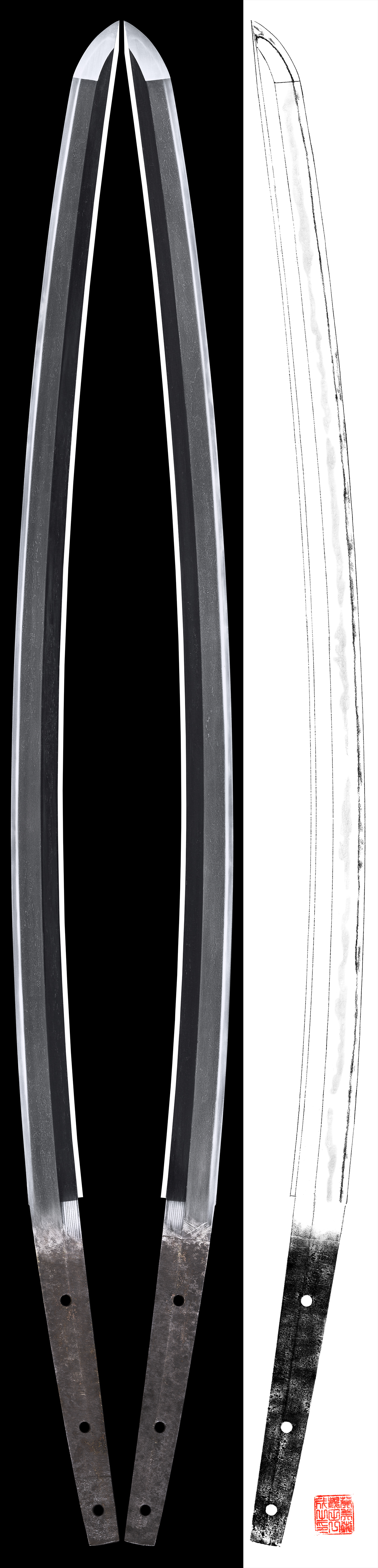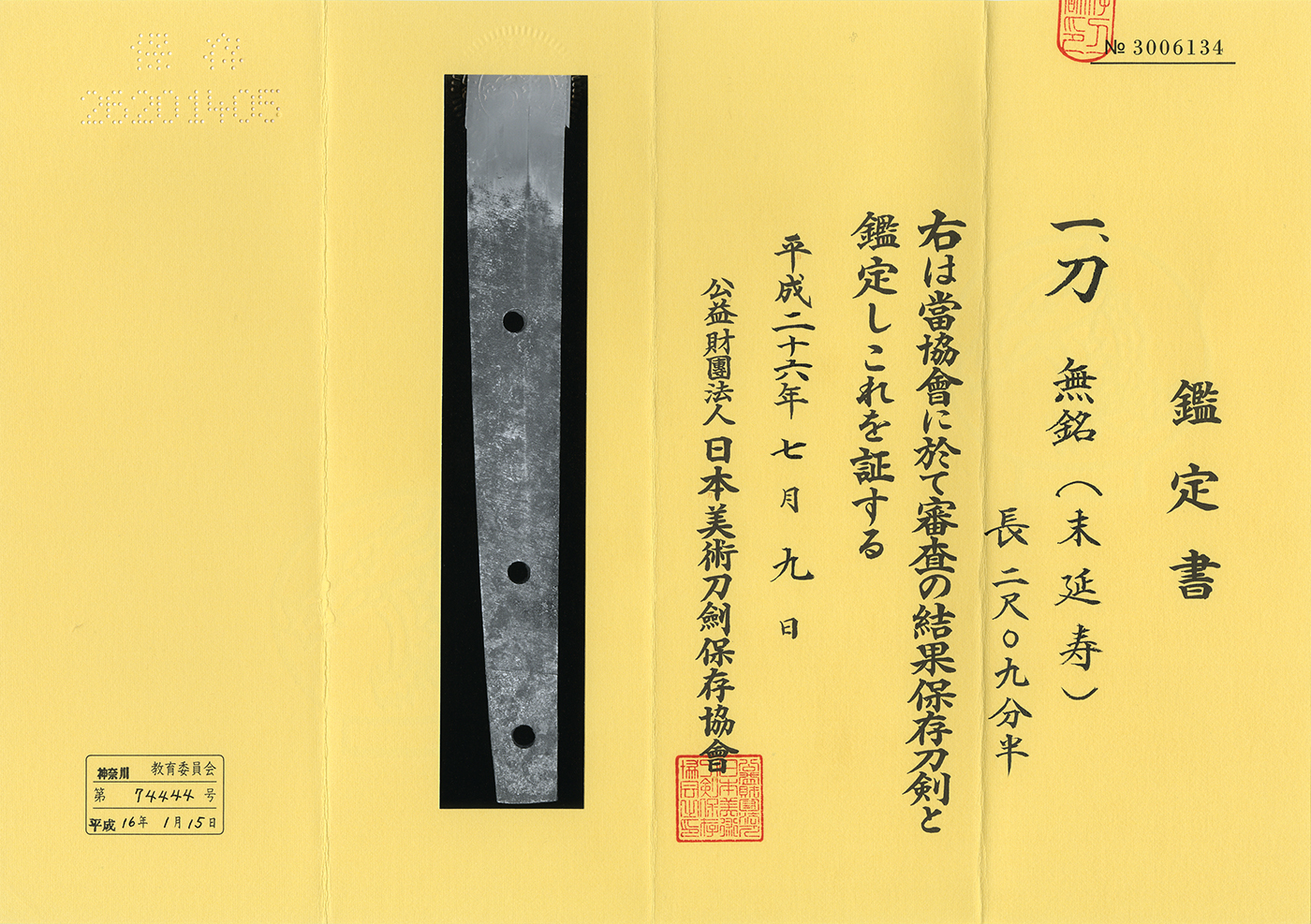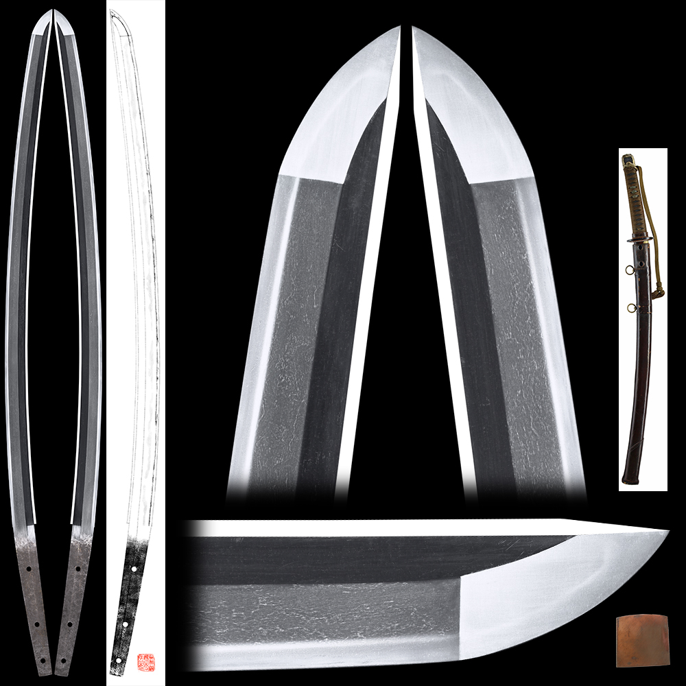 Shape : The blade is Osuriage Mumei、regular size katana with deep Sori.
