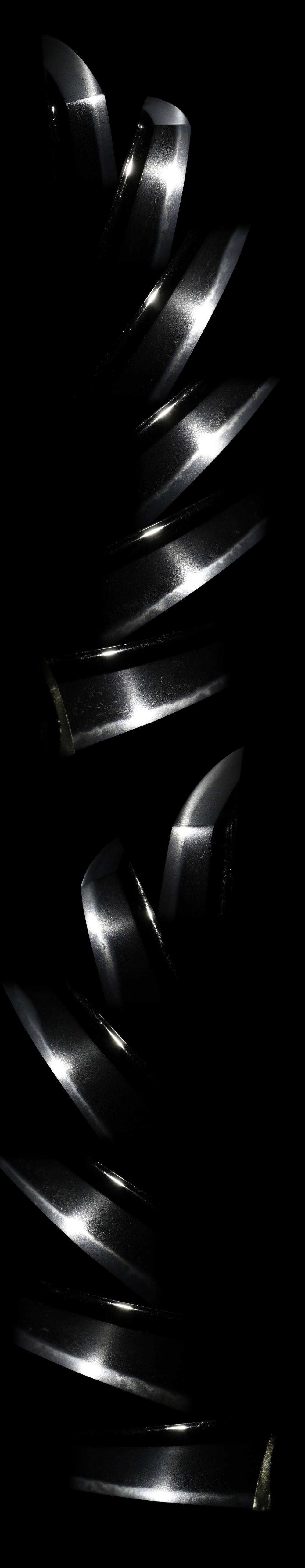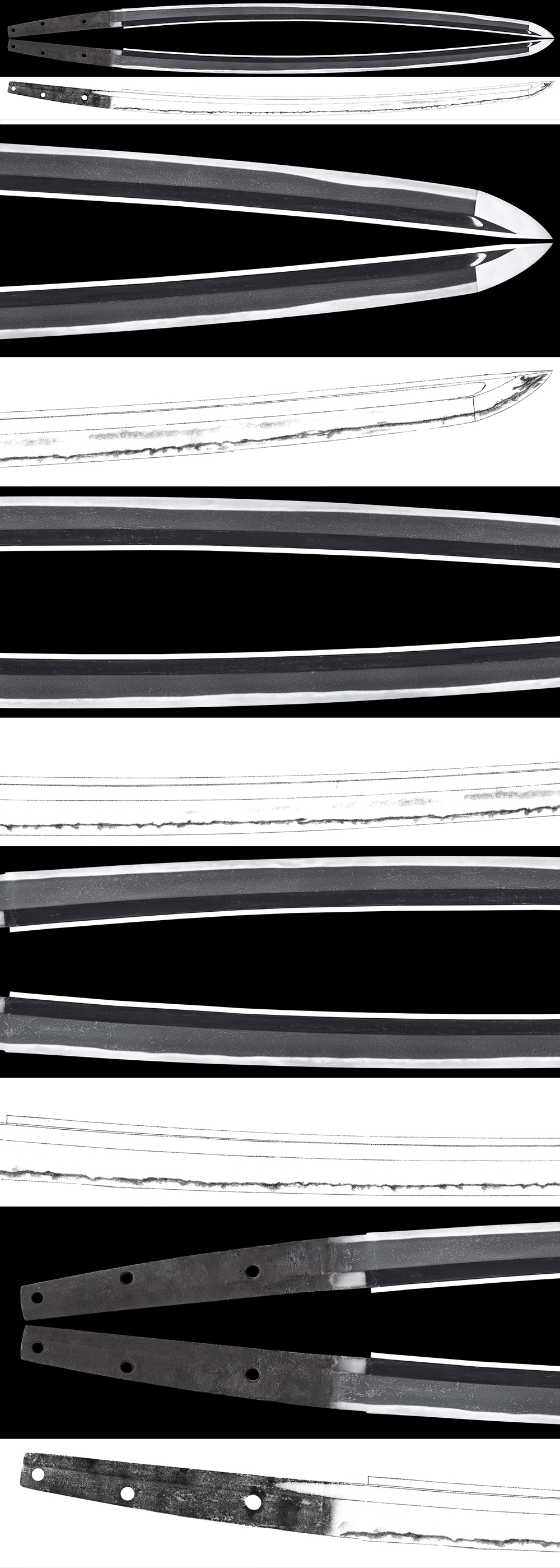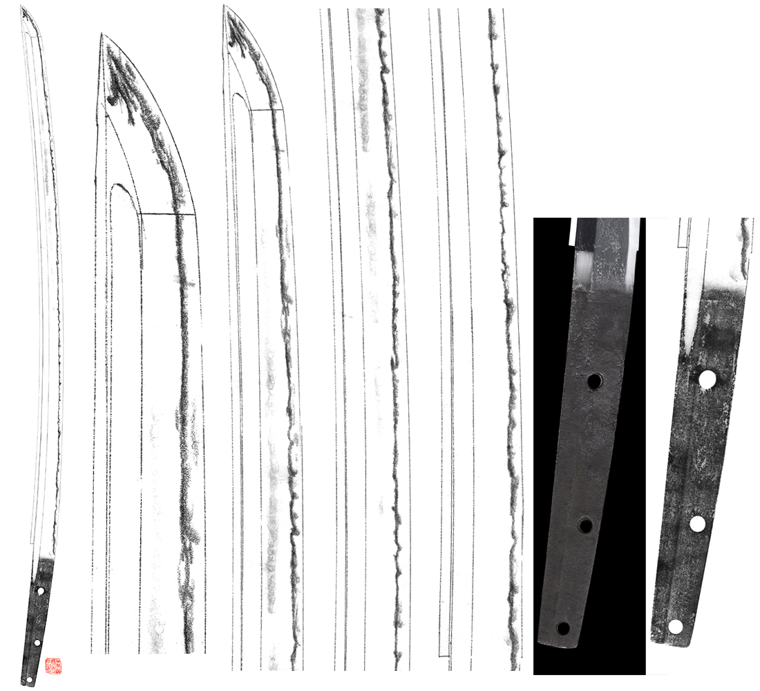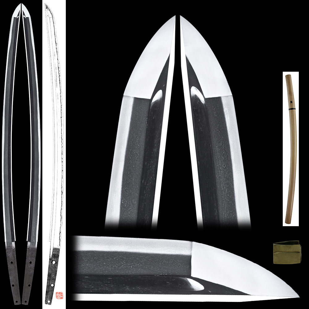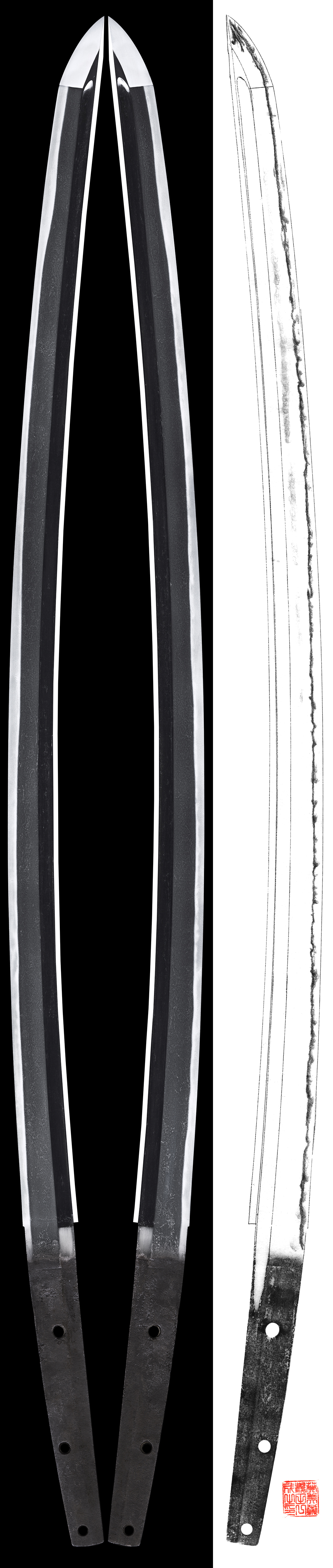 Shape : OoSuriage Mumei, wide and thick blade with long Kissaki. Bo-Hi is on both side.