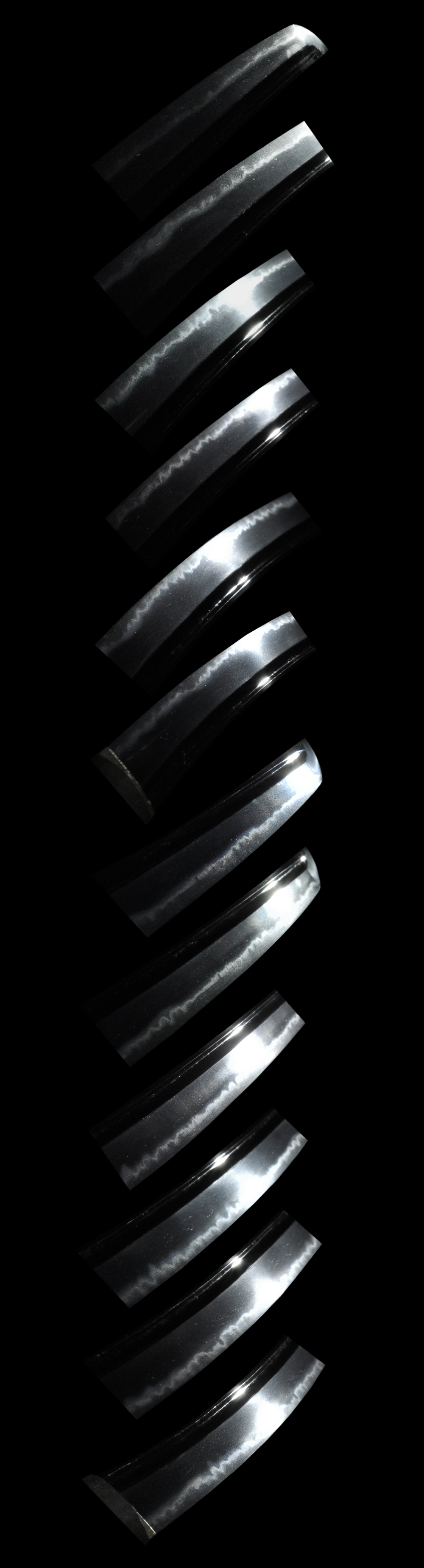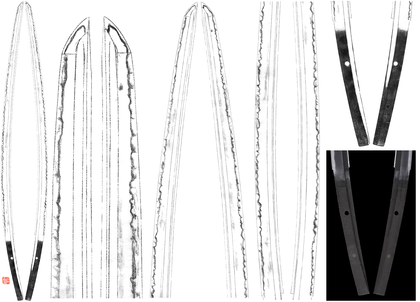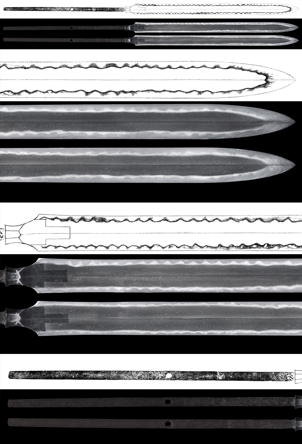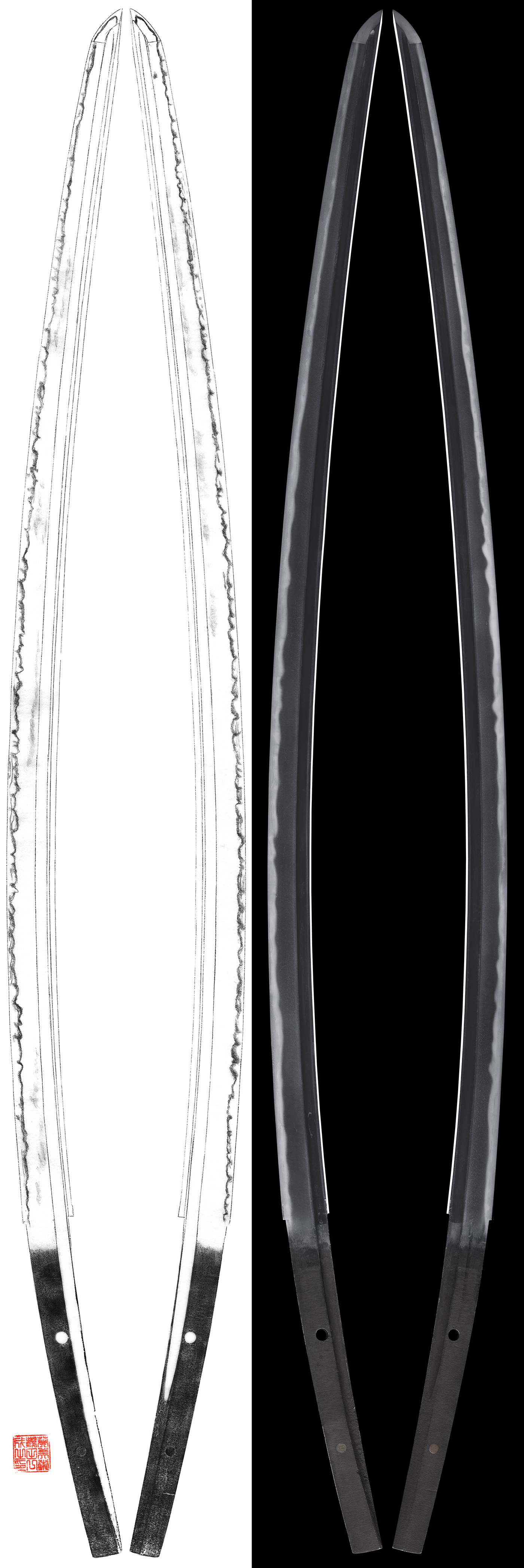 Alike Nagamitsu, there are gorgeous choji midare hamon where it becomes soft from the monouchi area.