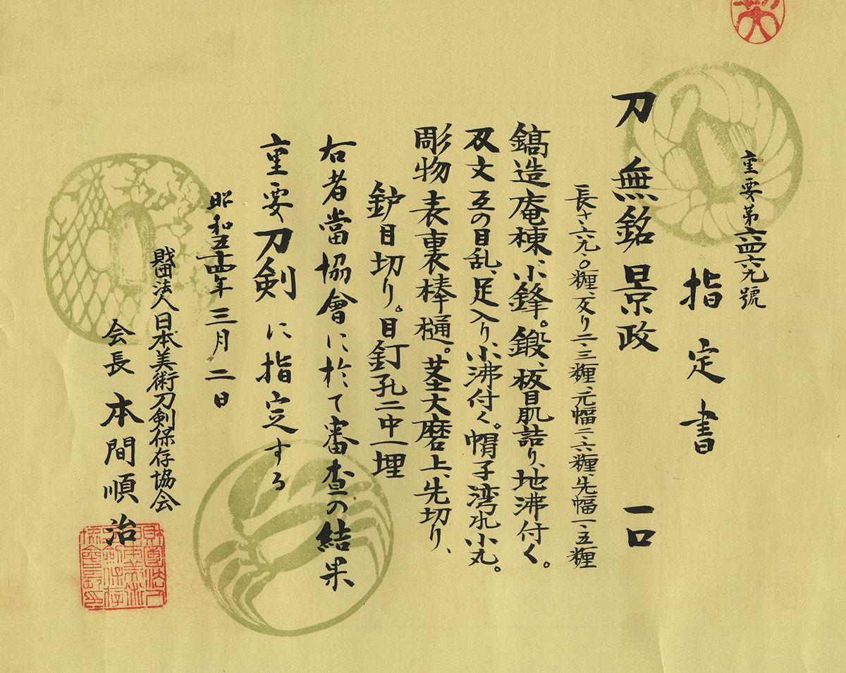 Katana: Mumei(Kagemasa)(26th NBTHk Juyo Token)