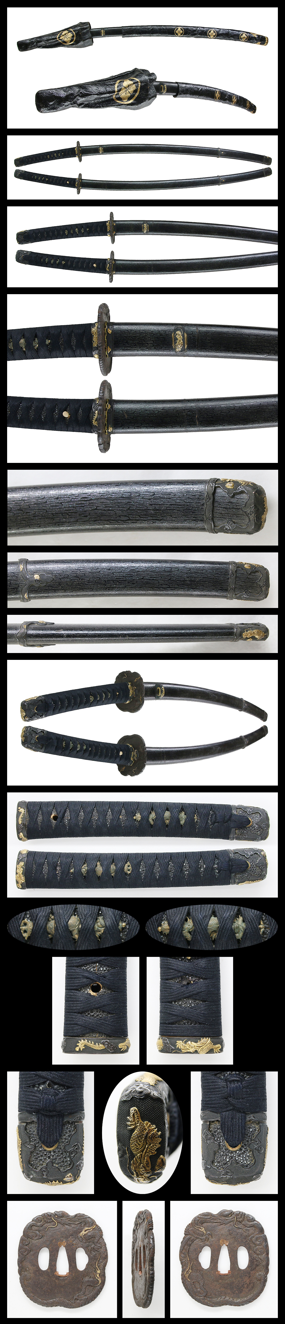 Koshirae is Issaku koshirae. The condition is fine condition. On the saya and tsula there is black skin with family crest engraved.