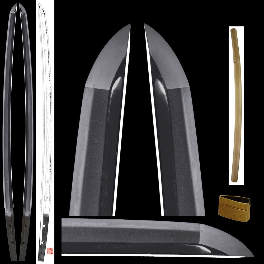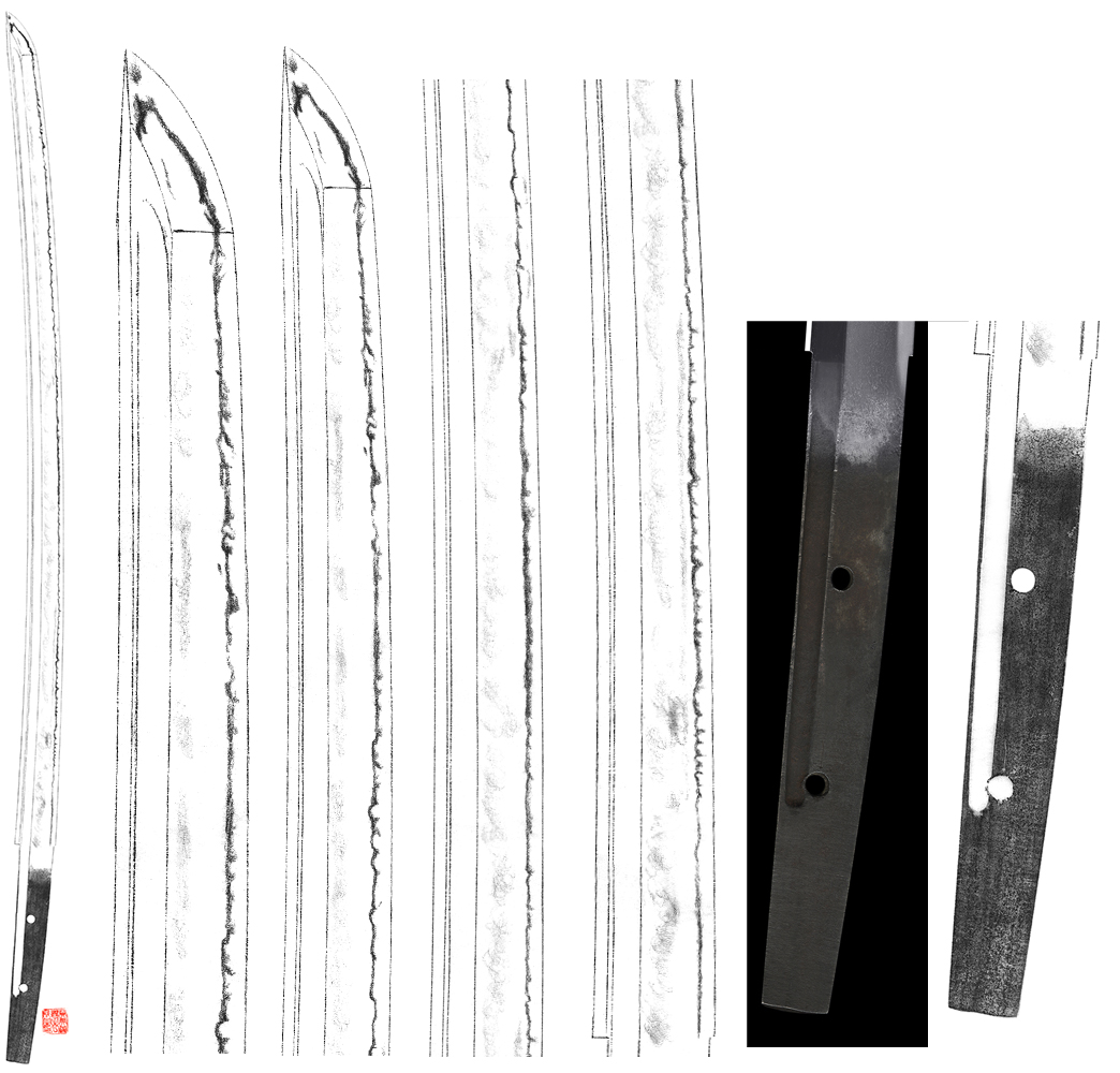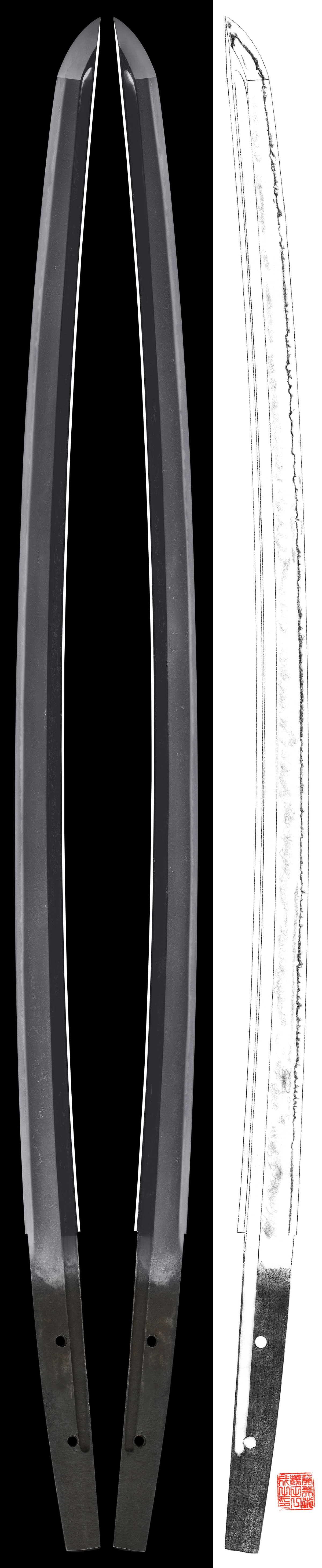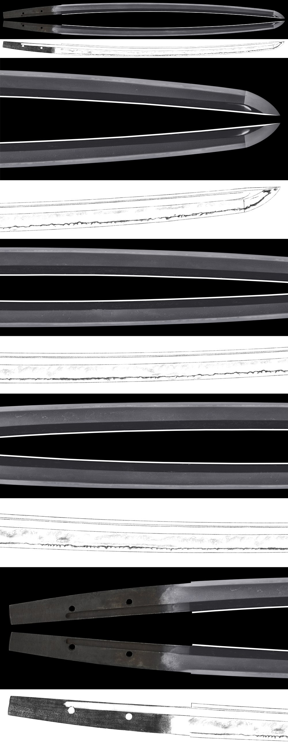 Shape : Oosuriage mumei. It is rather wide, regular thickness. There are bohi engraved on both side with long kissaki.