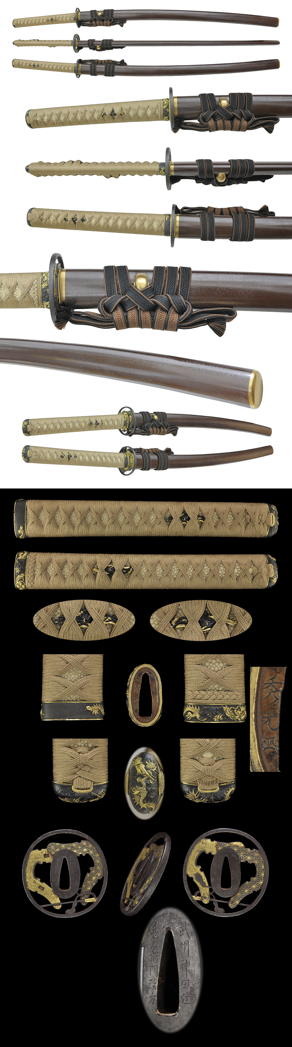 Menuki : Granulated shakudou with dragon engraved and inlayed with gold.