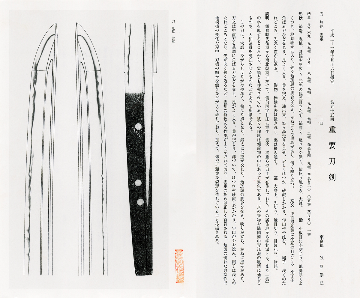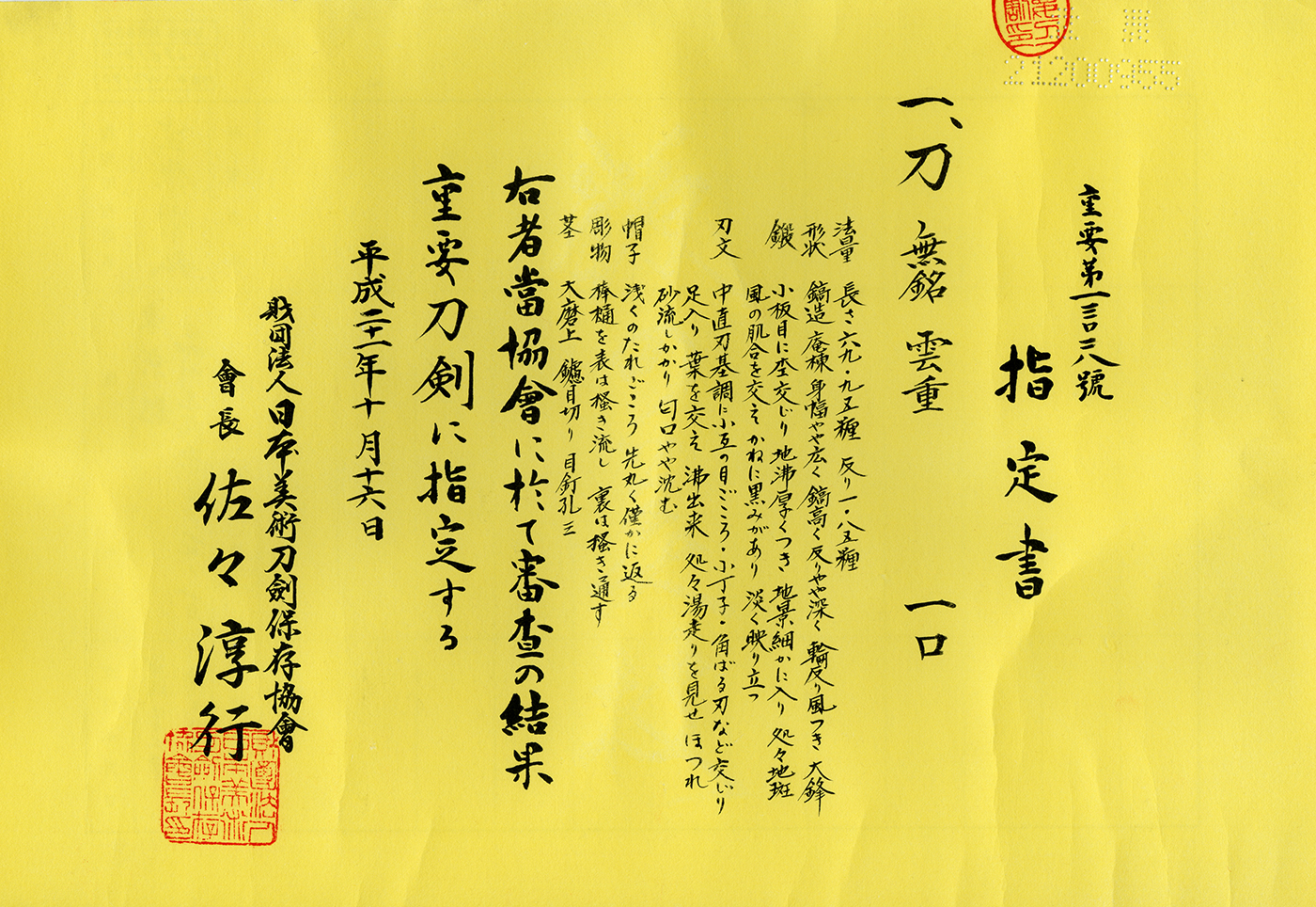Shape : Wide and thick blade with large Sori. The Ookissaki blade.