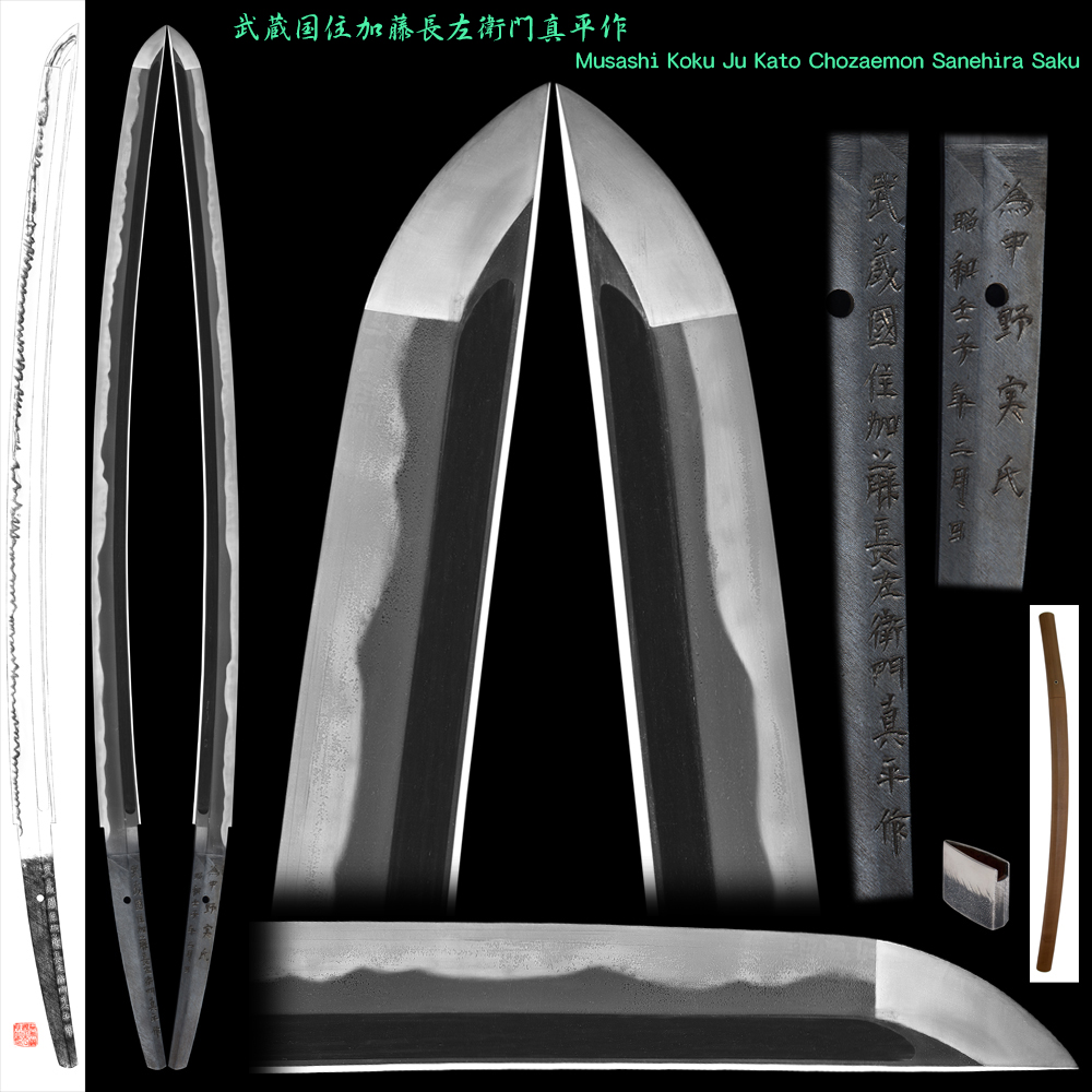 Sanehira was a well-known gendai swordmisth of Tokyo who was born in 1915. His real name was Sanehira Kato who learned under Horii Taneaki, Sanehira's father Kanekuni and Sanekuni. Sanehira worked as a Jumei-tosho of Japanese army in the prewar days. In the postwar Japan, Sanehira got 13 times of the Nusen prize at the annual sword-making competition held by the NBTHK. Once he succeeded his father's name Kanekuni as the Second in 1945. This name was handed over to his eldest son in 1965.